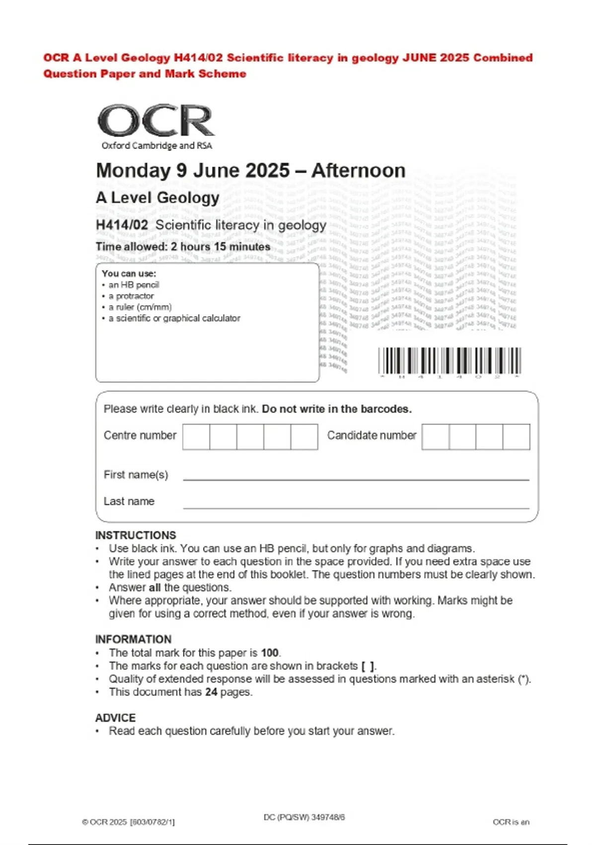 OCR A Level Geology H414/02 Scientific literacy in geology JUNE 2025 Combined Question Paper and Mark Scheme
