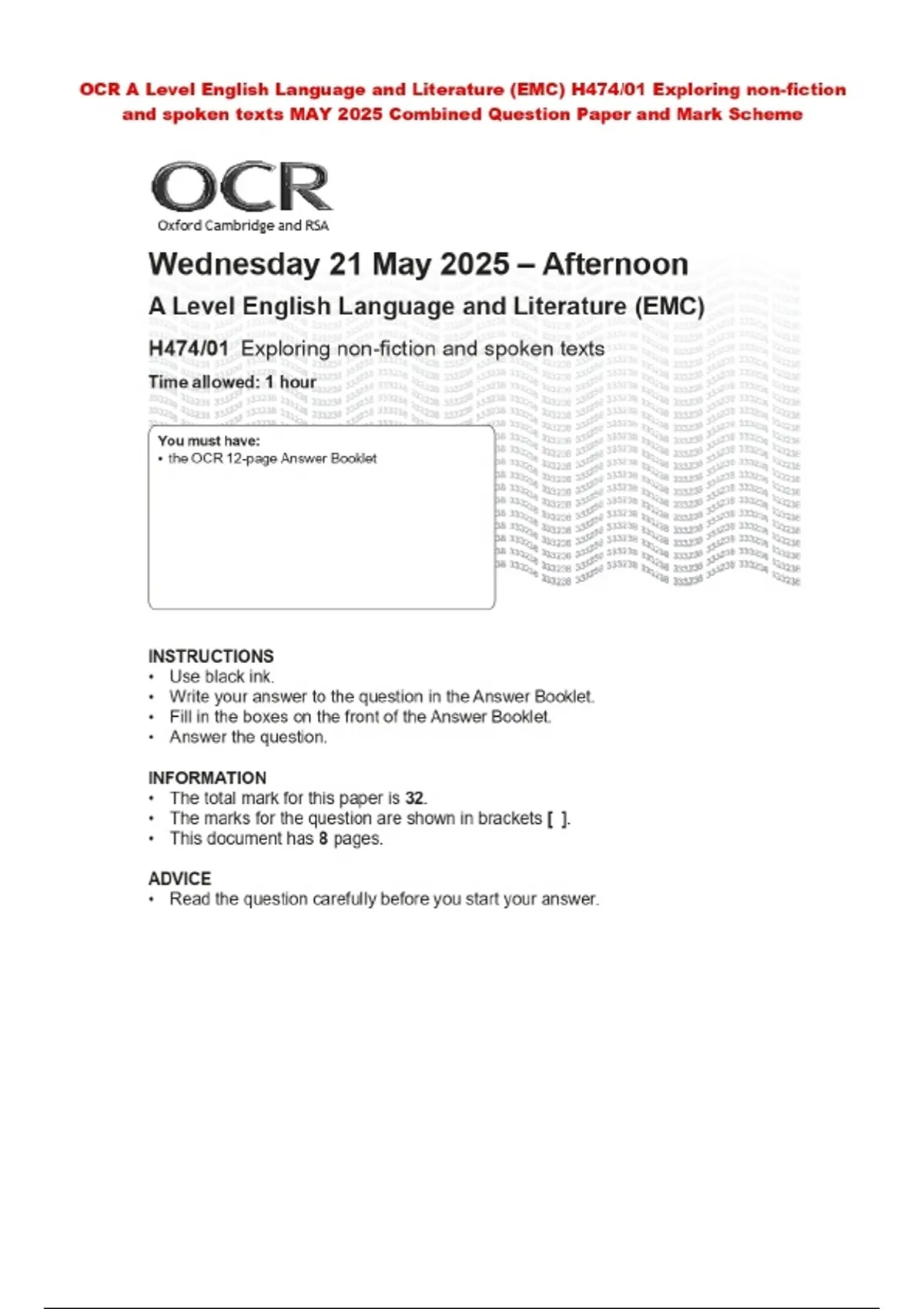 OCR A Level English Language and Literature (EMC) H474/01 Exploring non-fiction and spoken texts MAY 2025 Combined Question Paper and Mark Scheme