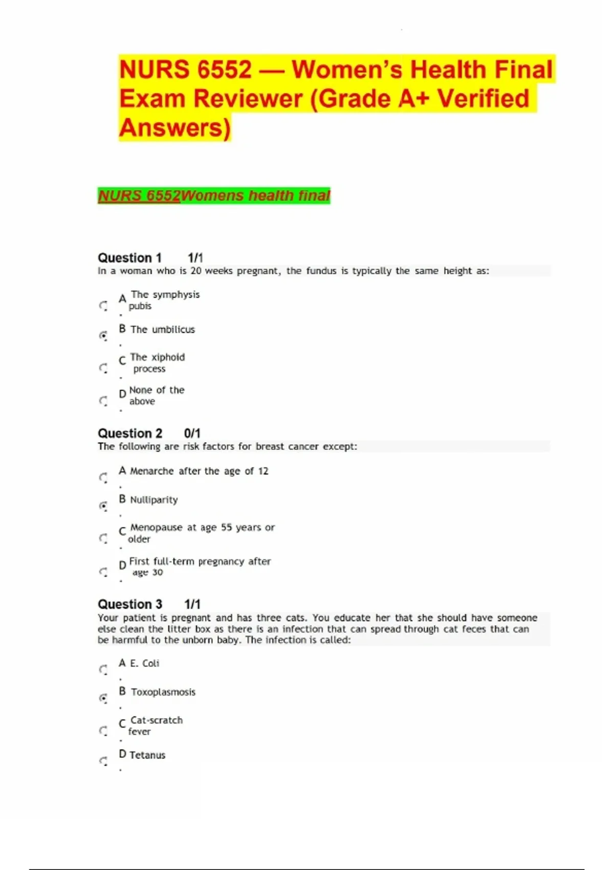NURS 6552 — Women’s Health Final Exam Reviewer (Grade A+ Verified Answers)A comprehensive exam reviewer for NURS 6552: Women’s Health, featuring verified questions and correct answers to help nursing students prepare for finals with confidence. This resource covers key topics in obstetrics, gynecology, reproductive health, and women’s wellness. Key coverage includes: - Pregnancy & Obstetrics: - Fundal height landmarks (20 weeks = umbilicus). - Maternal risk factors and prenatal screening. - Breast & Reproductive Health: - Breast cancer risk factors (e.g., nulliparity, late menopause, first pregnancy after 30). - Contraceptive methods — advantages/disadvantages of combined oral contraceptives. - Gastrointestinal & General Health: - Irritable bowel syndrome (IBS) pain relief with defecation. - Exposure risks (fish, lead paint, pottery, stained glass). - Sexual Development & Contraception: - Tanner scale stages of sexual maturity (five stages). - Non‑latex condoms and their higher risk of breakage/slippage. - Male Reproductive Health: - Semen analysis preparation (abstinence for 2–5 days). - Gynecologic Procedures: - Dilation and curettage, endometrial ablation, uterine artery embolization, hysterectomy. - Genetics & Risk Factors: - Maternal age ≥30, consanguinity, toxin exposure, congenital blindness/deafness. This reviewer provides exam‑style questions, rationales, and correct answers aligned with nursing practice standards, making it ideal for graduate nursing students preparing for NURS 6552 finals or clinical application exams