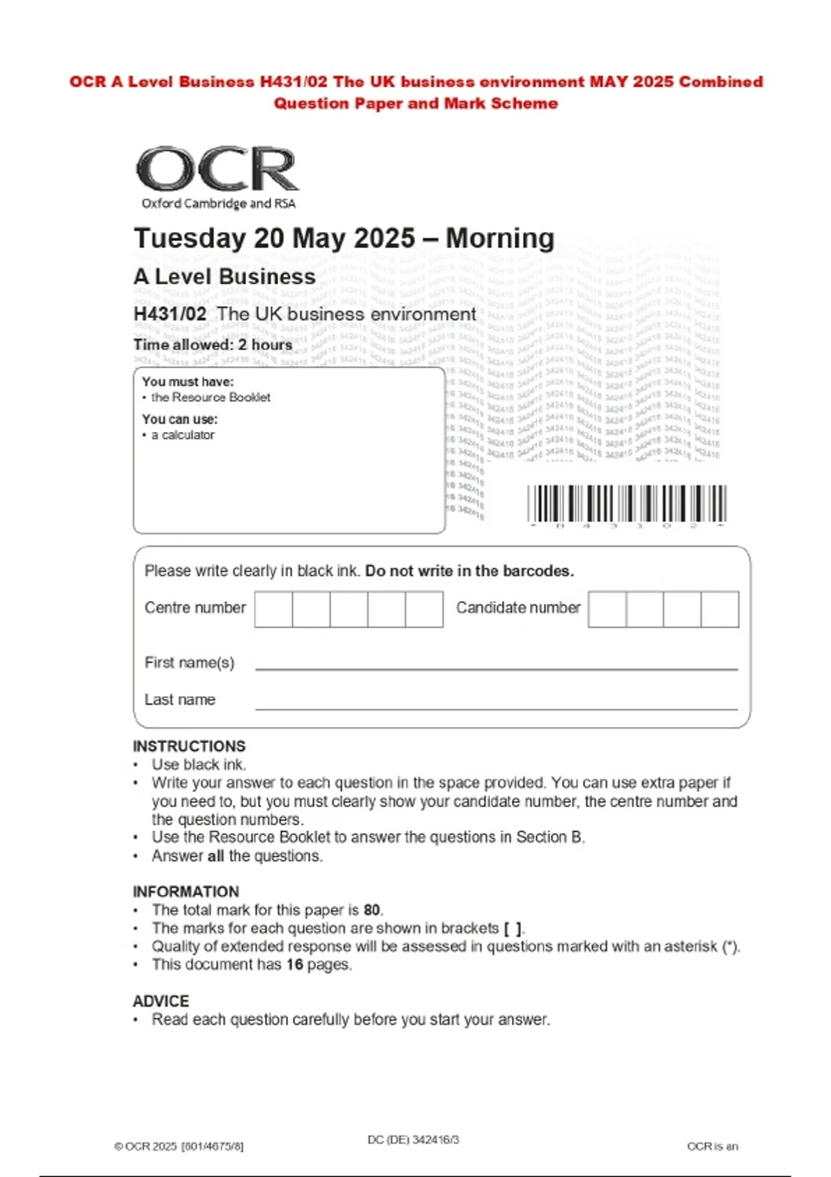 OCR A Level Business H431/02 The UK business environment MAY 2025 Combined Question Paper and Mark Scheme
