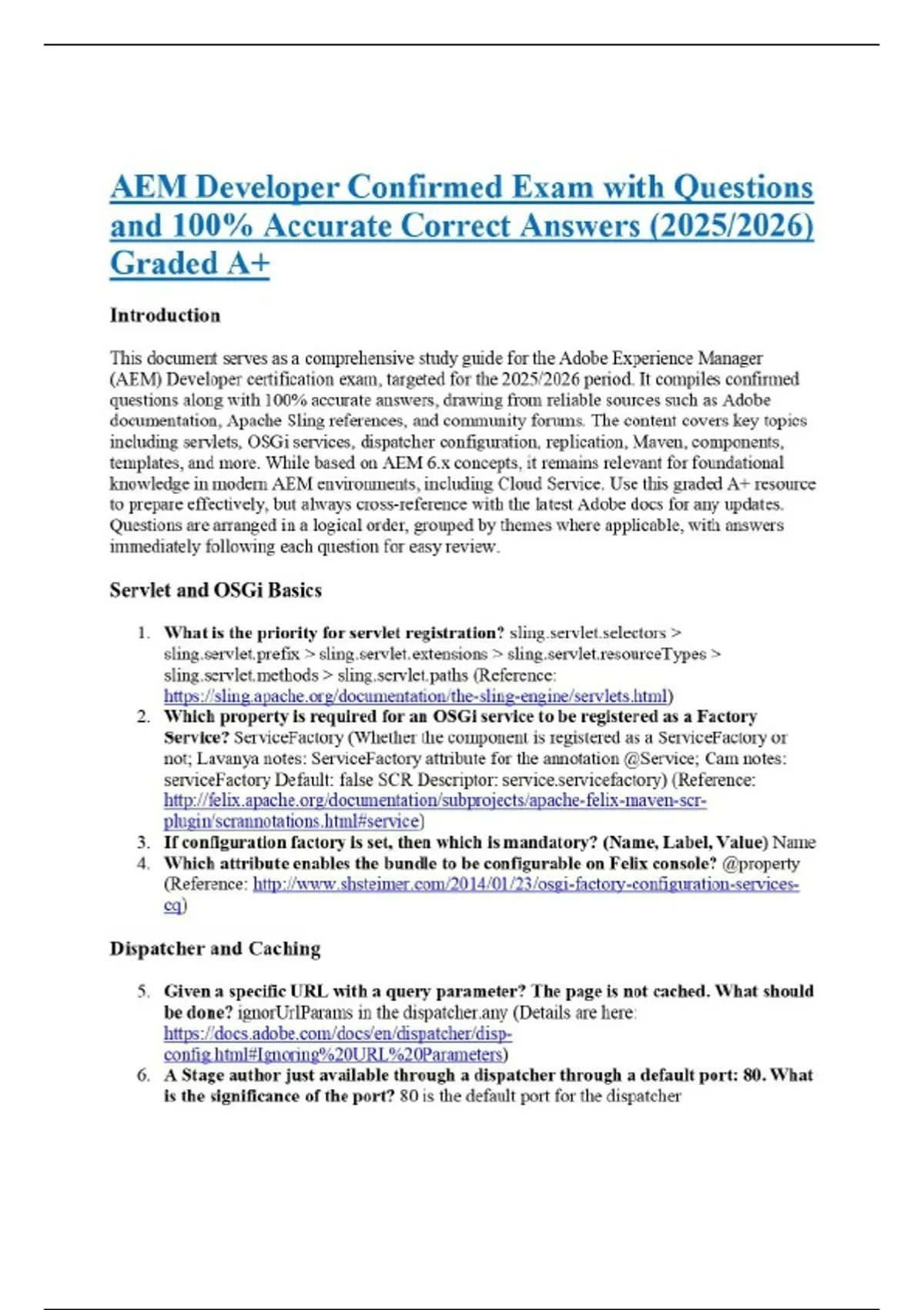AEM Developer Confirmed Exam with Questions and 100% Accurate Correct Answers (2025/2026) Graded A+ Introduction This document serves as a comprehensive study guide for the Adobe Experience Manager (AEM) Developer certification exam, targeted for the 2025/2026 period. It compiles confirmed questions along with 100% accurate answers, drawing from reliable sources such as Adobe documentation, Apache Sling references, and community forums. The content covers key topics including servlets, OSGi services, dispatcher configuration, replication, Maven, components, templates, and more. While based on AEM 6.x concepts, it remains relevant for foundational knowledge in modern AEM environments, including Cloud Service. Use this graded A+ resource to prepare effectively, but always cross-reference with the latest Adobe docs for any updates. Questions are arranged in a logical order, grouped by themes where applicable, with answers immediately following each question for easy review. Servlet and OSGi Basics 1. What is the priority for servlet registration? tors > x > sions > rceTypes > ds > (Reference: 2. Which property is required for an OSGi service to be registered as a Factory Service? ServiceFactory (Whether the component is registered as a ServiceFactory or not; Lavanya notes: ServiceFactory attribute for the annotation @Service; Cam notes: serviceFactory Default: false SCR Descriptor: cefactory) (Reference: 3. If configuration factory is set, then which is mandatory? (Name, Label, Value) Name 4. Which attribute enables the bundle to be configurable on Felix console? @property (Reference: Dispatcher and Caching 5. Given a specific URL with a query parameter? The page is not cached. What should be done? ignorUrlParams in the (Details are here: 6. A Stage author just available through a dispatcher through a default port: 80. What is the significance of the port? 80 is the default port for the dispatcher
