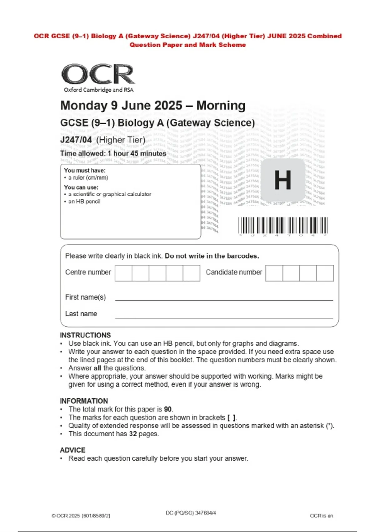 OCR GCSE (9–1) Biology A (Gateway Science) J247/04 (Higher Tier) JUNE 2025 Combined Question Paper and Mark Scheme