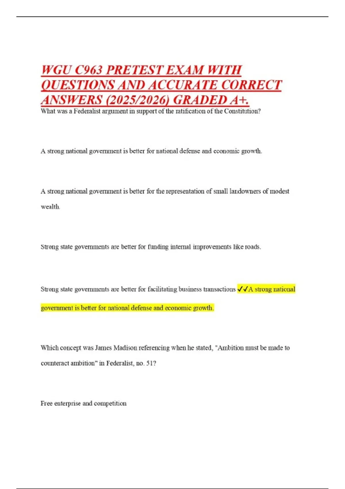 WGU C963 PRETEST EXAM WITH QUESTIONS AND ACCURATE CORRECT ANSWERS (2025/2026) GRADED A+. What was a Federalist argument in support of the ratification of the Constitution? A strong national government is better for national defense and economic growth. A strong national government is better for the representation of small landowners of modest wealth. Strong state governments are better for funding internal improvements like roads.
