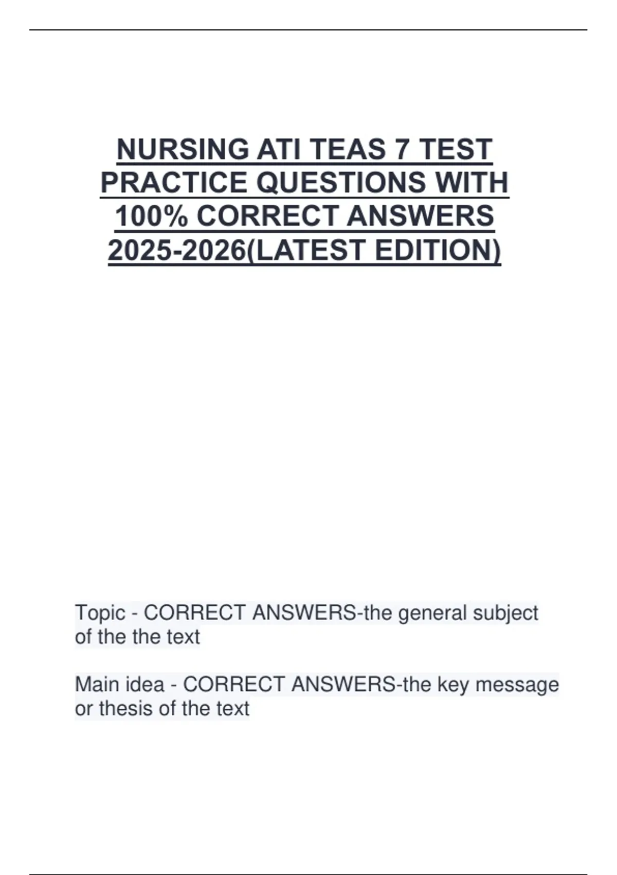 NURSING ATI TEAS 7 TEST PRACTICE QUESTIONS WITH 100% CORRECT ANSWERS (LATEST EDITION)