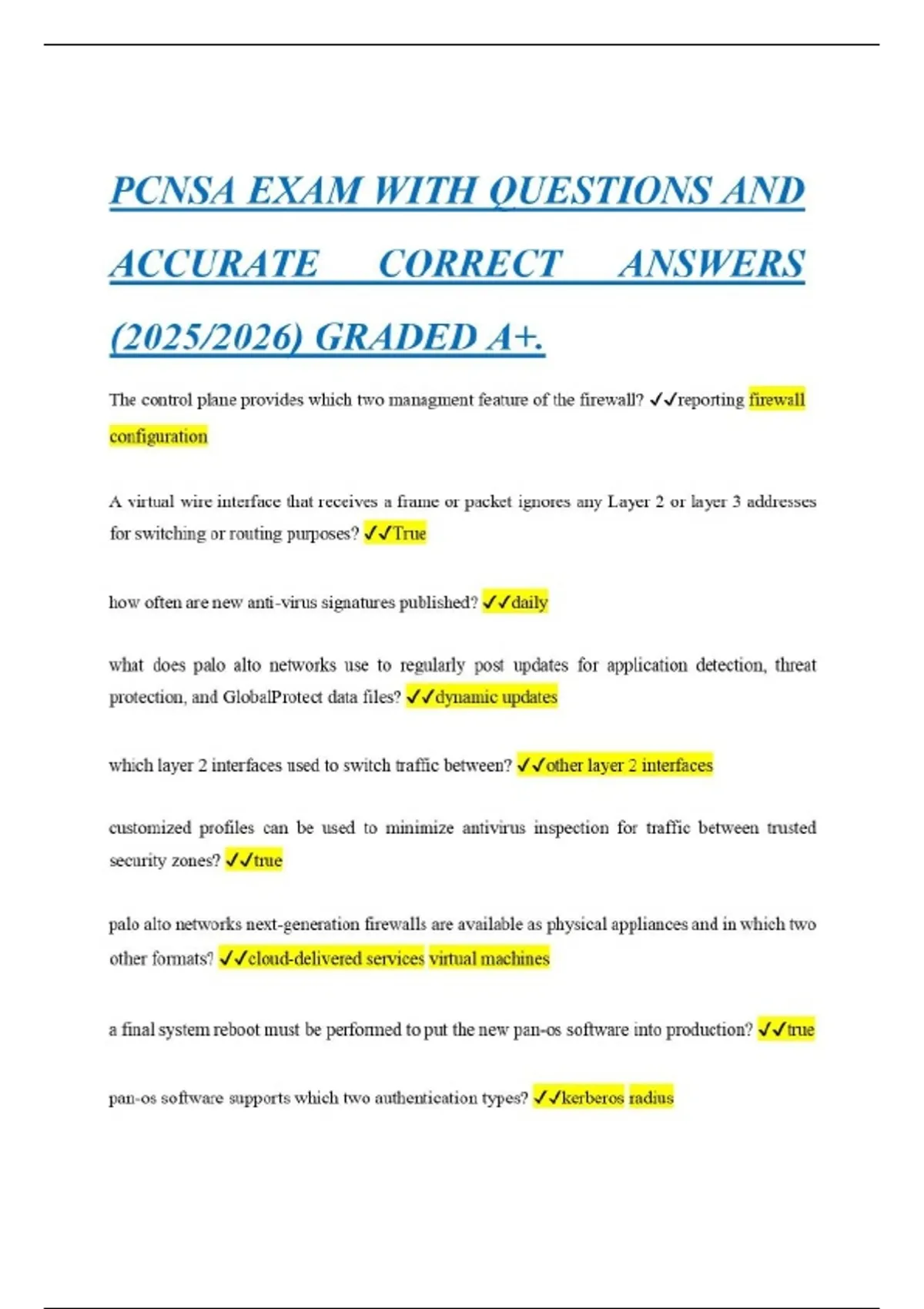PCNSA EXAM WITH QUESTIONS AND ACCURATE CORRECT ANSWERS (2025/2026) GRADED A+. The control plane provides which two managment feature of the firewall? reporting firewall configuration A virtual wire interface that receives a frame or packet ignores any Layer 2 or layer 3 addresses for switching or routing purposes? True how often are new anti-virus signatures published? daily what does palo alto networks use to regularly post updates for application detection, threat protection, and GlobalProtect data files? dynamic updates