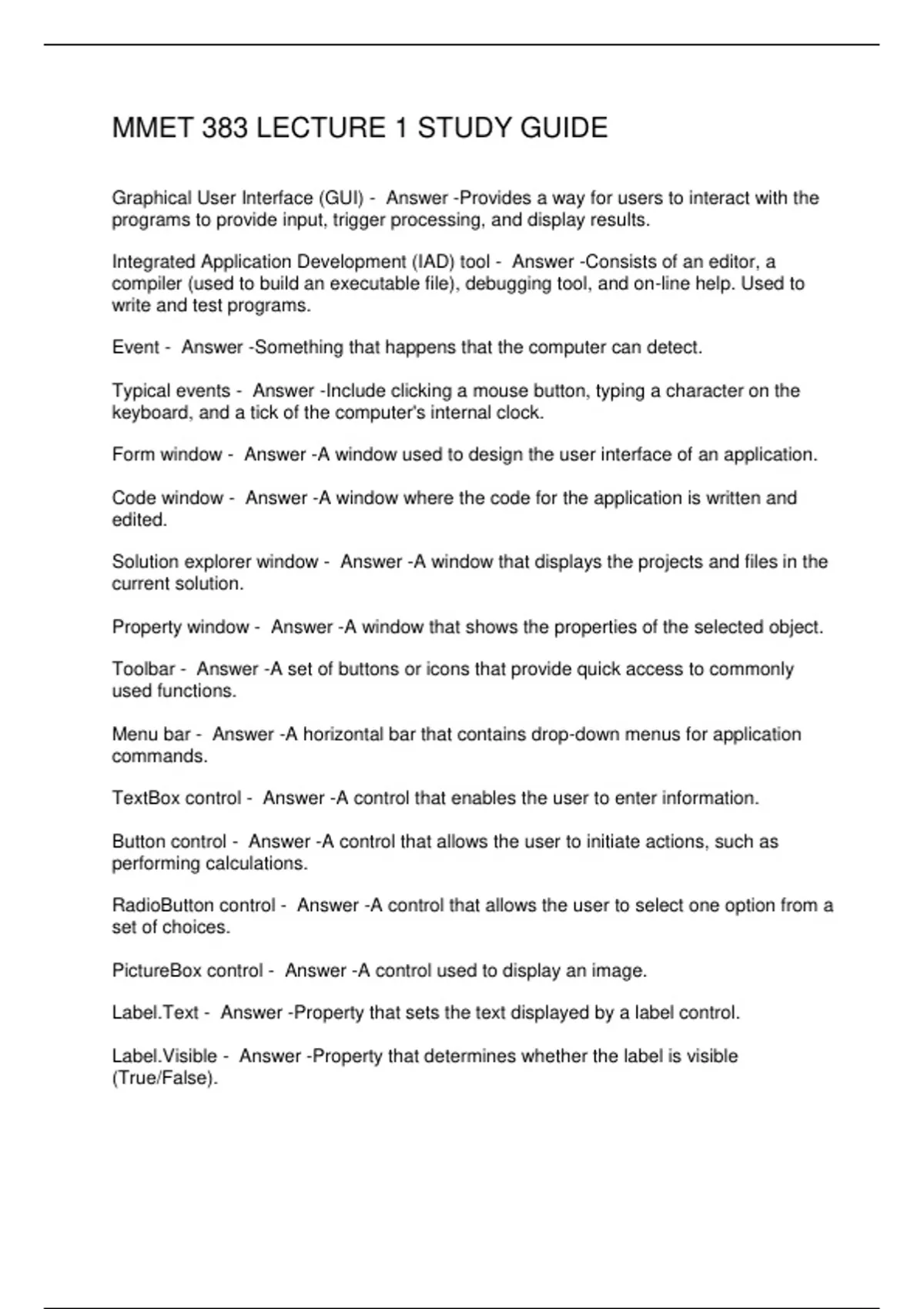 MMET 383 LECTURE 1 STUDY GUIDE