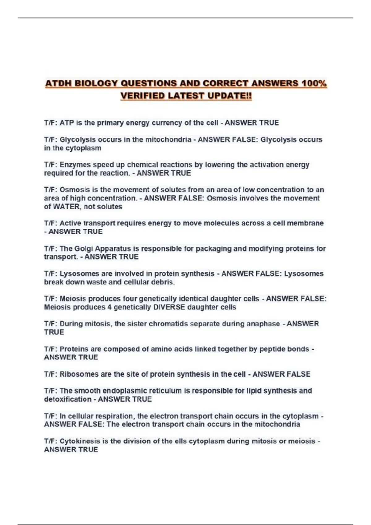 ATDH BIOLOGY QUESTIONS AND CORRECT ANSWERS 100% VERIFIED LATEST UPDATE!!...
