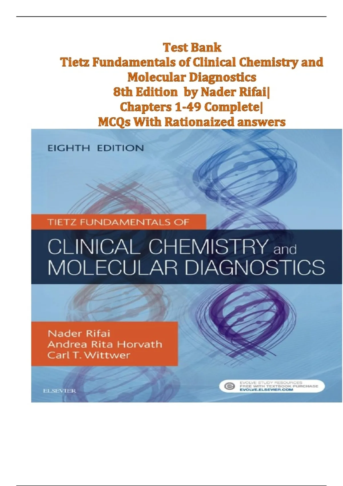 This comprehensive test bank for Tietz Fundamentals of Clinical Chemistry and Molecular Diagnostics, 8th Edition provides over 1,300 multiple-choice questions (MCQs) with fully rationalized answers, covering all 49 chapters of the textbook. Designed to support both instructors and students, it includes critical topics such as laboratory principles, analytical techniques, analytes, pathophysiology, and molecular diagnostics. Each question is referenced to textbook pages and aligned with learning objectives, making it an essential resource for exam preparation, curriculum development, and self-assessment in clinical chemistry and molecular diagnostics.