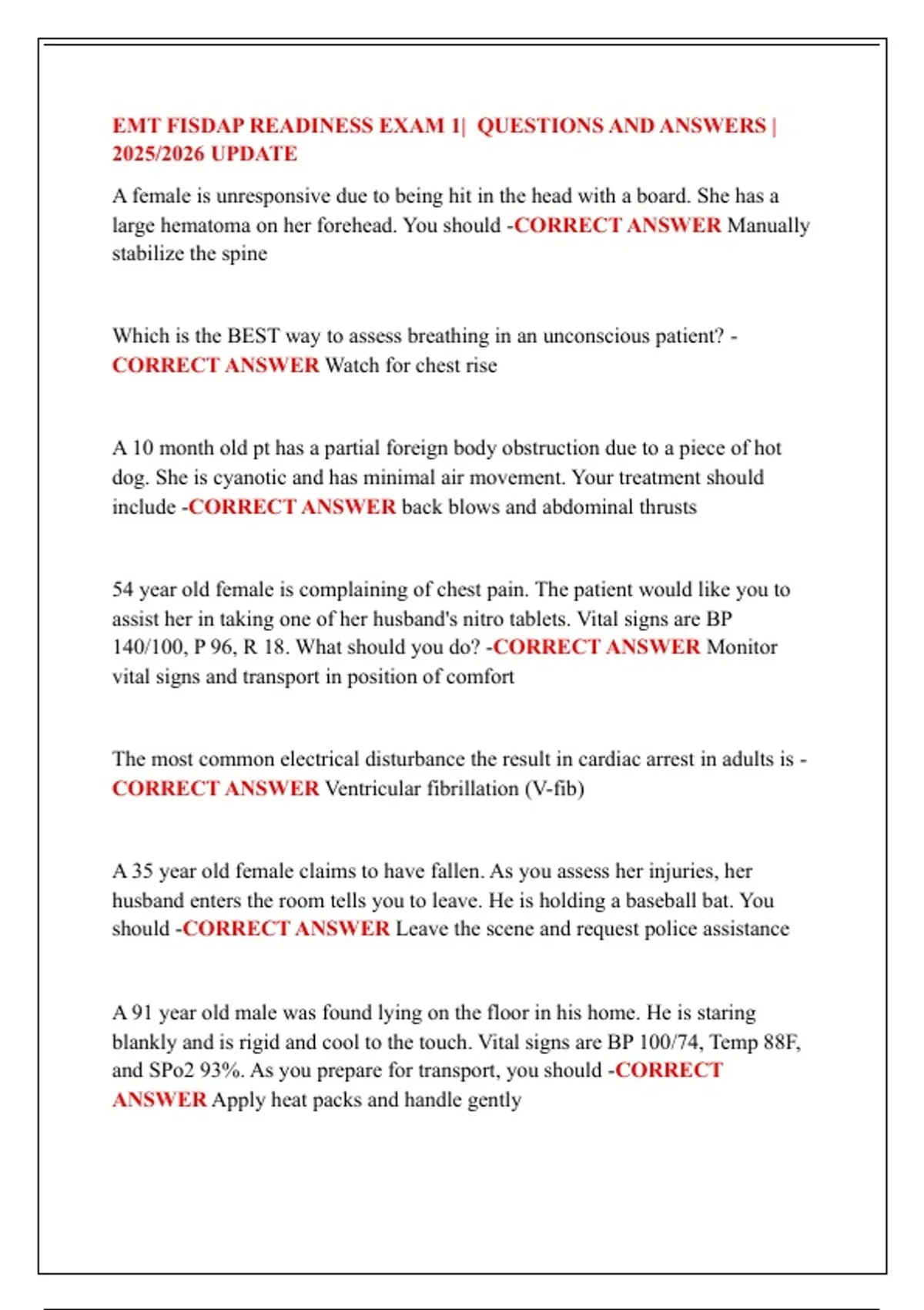 EMT FISDAP READINESS EXAM 1| QUESTIONS AND ANSWERS |