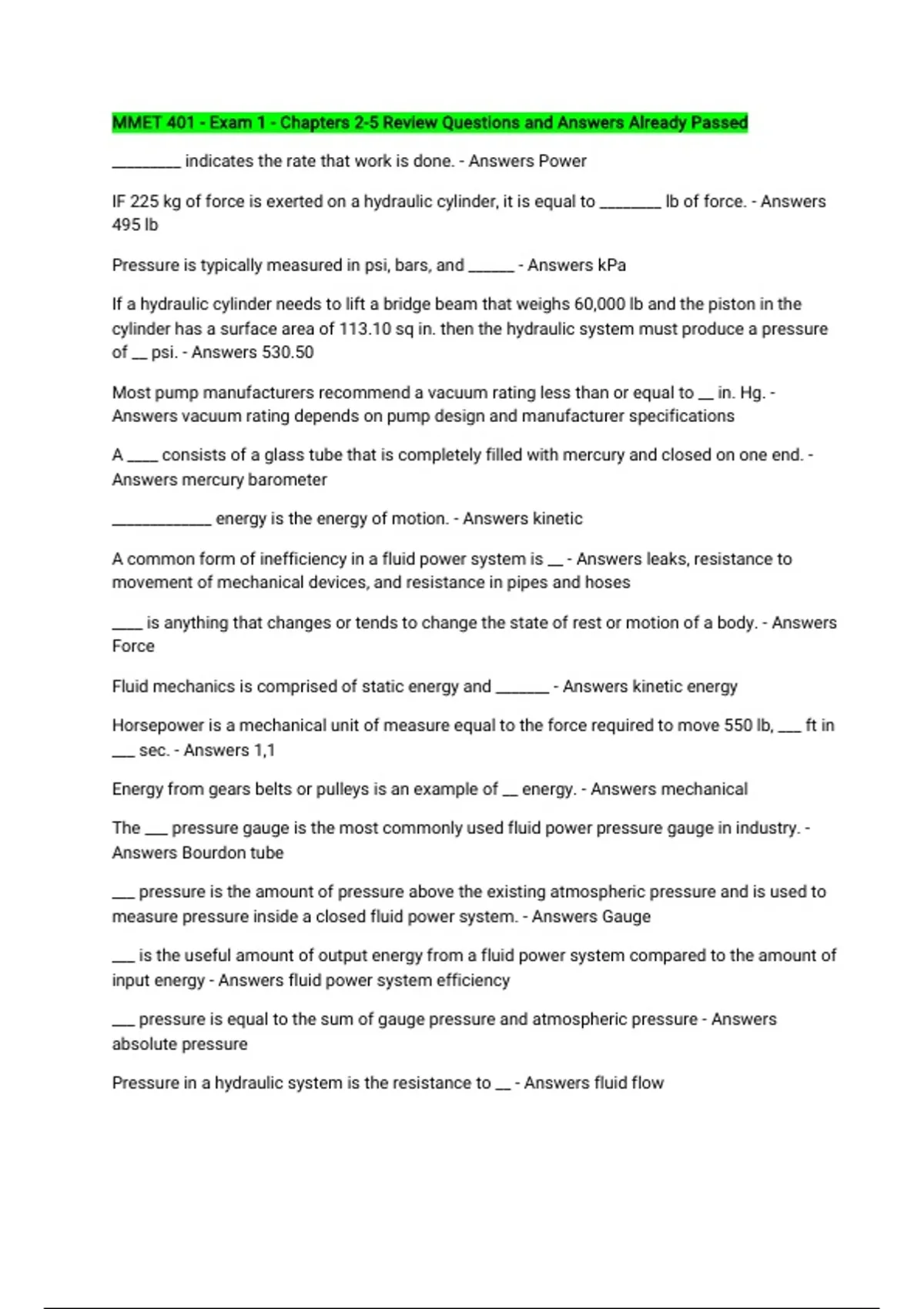 MMET 401 - Exam 1 - Chapters 2-5 Review Questions and Answers Already Passed _________ indicates the rate that work is done. - Answers Power IF 225 kg of force is exerted on a hydraulic cylinder, it is equal to ________ lb of force. - Answers 495 lb Pressure is typically measured in psi, bars, and ______ - Answers kPa If a hydraulic cylinder needs to lift a bridge beam that weighs 60,000 lb and the piston in the cylinder has a surface area of 113.10 sq in. then the hydraulic system must produce a pressure of __ psi. - Answers 530.50 Most pump manufacturers recommend a vacuum rating less than or equal to __ in. Hg. - Answers vacuum rating depends on pump design and manufacturer specifications A ____ consists of a glass tube that is completely filled with mercury and closed on one end. - Answers mercury barometer _____________ energy is the energy of motion. - Answers kinetic A common form of inefficiency in a fluid power system is __ - Answers leaks, resistance to movement of mechanical devices, and resistance in pipes and hoses ____ is anything that changes or tends to change the state of rest or motion of a body. - Answers Force Fluid mechanics is comprised of static energy and _______ - Answers kinetic energy Horsepower is a mechanical unit of measure equal to the force required to move 550 lb, ___ ft in ___ sec. - Answers 1,1 Energy from gears belts or pulleys is an example of __ energy. - Answers mechanical The ___ pressure gauge is the most commonly used fluid power pressure gauge in industry. - Answers Bourdon tube ___ pressure is the amount of pressure above the existing atmospheric pressure and is used to measure pressure inside a closed fluid power system. - Answers Gauge ___ is the useful amount of output energy from a fluid power system compared to the amount of input energy - Answers fluid power system efficiency ___ pressure is equal to the sum of gauge pressure and atmospheric pressure - Answers absolute pressure Pressure in a hydraulic system is the resistance to __ - Answers fluid flow