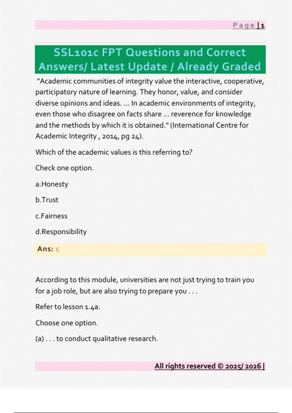 "Academic communities of integrity value the interactive, cooperative, participatory nature of learning. They honor, value, and consider diverse opinions and ideas. ... In academic environments of integrity, even those who disagree on facts share ... reverence for knowledge and the methods by which it is obtained." (International Centre for Academic Integrity , 2014, pg 24). Which of the academic values is this referring to? Check one option. a.Honesty b.Trust c.Fairness d.Responsibility Ans: c According to this module, universities are not just trying to train you for a job role, but are also trying to prepare you . . . Refer to lesson 1.4a. Choose one option. (a) . . . to conduct qualitative research. All rights reserved © 2025/ 2026 | Page | 2 (b) . . . to not cheat. (c) . . . to not become involved in political scandals. (d) . . . to behave ethically. Ans: d Stuart is an international student not used to writing in English. He has a 1,000 word essay due in a week. He knows that while his ideas are good, his structure and grasp of academic language are pretty bad. He asks his friend Liam, a native English speaker, to check his essay for him and suggest how he can improve it. When Liam gives him the essay back, Stuart is amazed. Liam has nicely re-written whole paragraphs of Stuart's ideas and obviously put a lot of effort into making it sound academic. However, Stuart is a little worried because he can barely recognize the essay - he even had to translate a few words! What kind of academic misconduct would Stuart be committing if he handed it in? Refer to lesson 1.4a. Check one option. (a). Cheating (b). Plagiarism (c). Facilitation of academic misconduct All rights reserved © 2025/ 2026 | Page | 3 (d). Fabrication of data (e). Falsification of data It isn't academic misconduct because Stuart wrote the original. Ans: b Myer has just had a really long day and is finishing up a Physics experiment in the lab. When Myer goes to save the data she's been working on, her computer malfunctions and she is forced to restart it. Unfortunately, because of this, Myer has just lost all of the results from the experiments she's been doing for the past three hours. Myer is horrified and quickly starts to write down all of the numbers that she remembers. She can accurately remember half of them, is pretty confident about another 30%, but has no idea what the final 20% are. She checks the time and realizes that if she starts the experiment again she will be in the lab until 11pm, and she is already exhausted. What should Myer do? Refer to lesson 1.4a. Check one option. (a). Have a break, calm down and come back and do the experiment again. She needs to have the proper results. (b). Write down all the results she remembers and then guess the final 20 All rights reserved © 2025/ 2026 | Page | 4 Ans: a Considering the same example as above; Myer has just had a really long day and is finishing up a Physics experiment in the lab. When Myer goes to save the data she's been working on, her computer malfunctions and she is forced to restart it. Unfortunately, because of this, Myer has just lost all of the results from the experiments she's been doing for the past three hours. Myer is horrified and quickly starts to write down all of the numbers that she remembers. She can accurately remember half of them, is pretty confiden