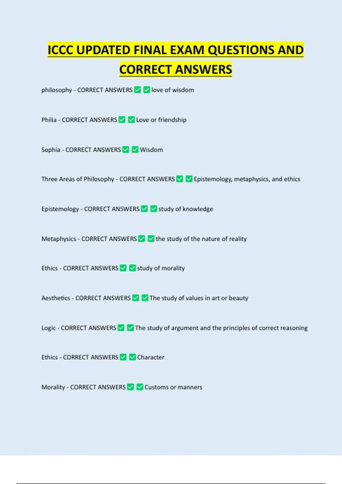 ICCC UPDATED FINAL EXAM QUESTIONS AND CORRECT ANSWERS philosophy - CORRECT ANSWERS Philia - CORRECT ANSWERS Sophia - CORRECT ANSWERS love of wisdom Love or friendship Wisdom Three Areas of Philosophy - CORRECT ANSWERS Epistemology - CORRECT ANSWERS Epistemology, metaphysics, and ethics study of knowledge Metaphysics - CORRECT ANSWERS Ethics - CORRECT ANSWERS Aesthetics - CORRECT ANSWERS Logic - CORRECT ANSWERS the study of the nature of reality study of morality The study of values in art or beauty