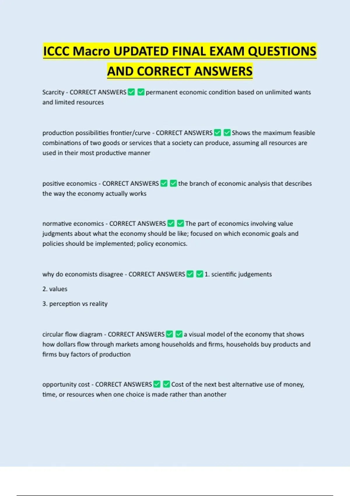 ICCC Macro UPDATED FINAL EXAM QUESTIONS AND CORRECT ANSWERS Scarcity - CORRECT ANSWERS and limited resources permanent economic condition based on unlimited wants production possibilities frontier/curve - CORRECT ANSWERS Shows the maximum feasible combinations of two goods or services that a society can produce, assuming all resources are used in their most productive manner positive economics - CORRECT ANSWERS the way the economy actually works normative economics - CORRECT ANSWERS the branch of economic analysis that describes The part of economics involving value judgments about what the economy should be like; focused on which economic goals and policies should be implemented; policy economics. why do economists disagree - CORRECT ANSWERS 2. values 3. perception vs reality circular flow diagram - CORRECT ANSWERS 1. scientific judgements a visual model of the economy that shows how dollars flow through markets among households and firms, households buy products and f irms buy factors of production opportunity cost - CORRECT ANSWERS Cost of the next best alternative use of money, t ime, or resources when one choice is made rather than another