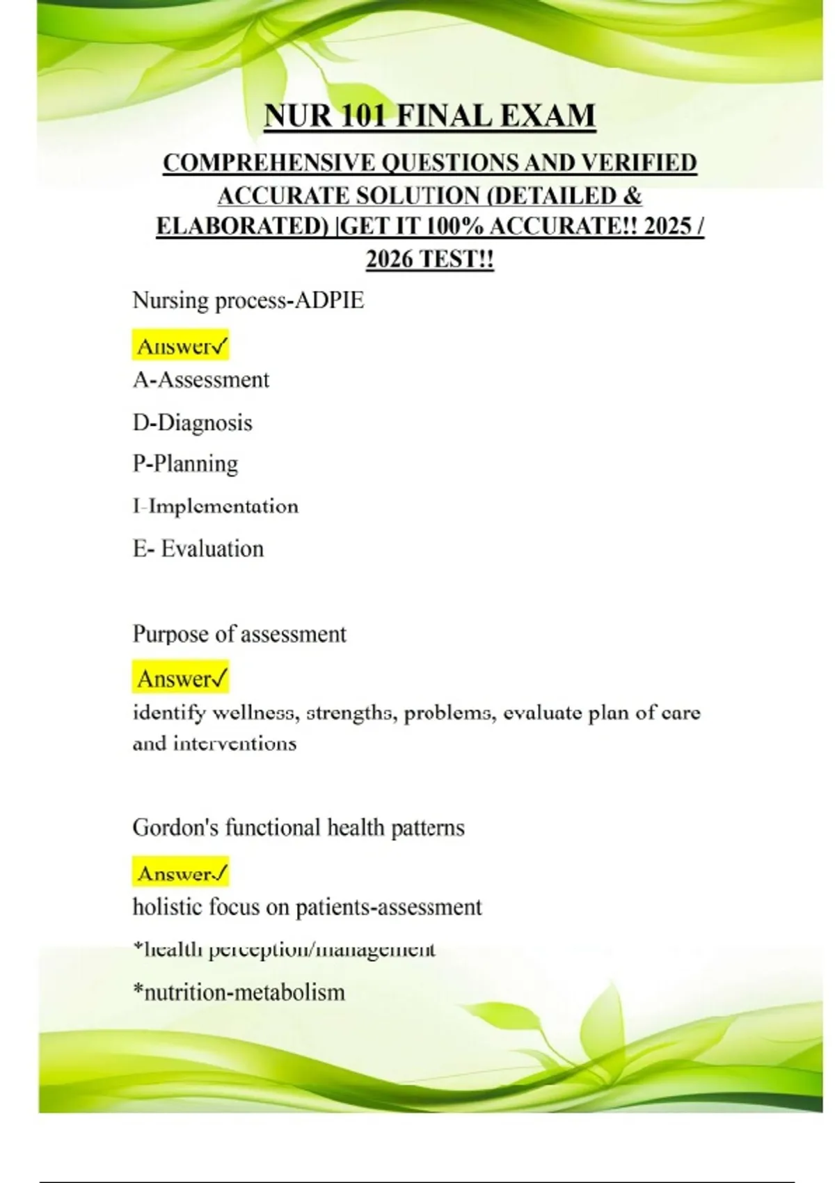 NUR 101 FINAL EXAM COMPREHENSIVE QUESTIONS AND VERIFIED ACCURATE SOLUTION (DETAILED & ELABORATED) |GET IT 100% ACCURATE!! 2025 / 2026 TEST!!