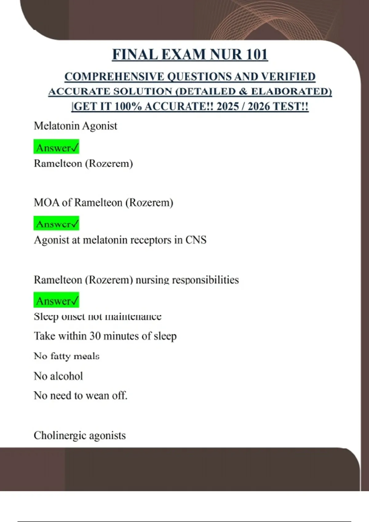 FINAL EXAM NUR 101 COMPREHENSIVE QUESTIONS AND VERIFIED ACCURATE SOLUTION (DETAILED & ELABORATED) |GET IT 100% ACCURATE!! 2025 / 2026 TEST!! Melatonin Agonist Answer Ramelteon (Rozerem) MOA of Ramelteon (Rozerem) Answer Agonist at melatonin receptors in CNS Ramelteon (Rozerem) nursing responsibilities Answer Sleep onset not maintenance Take within 30 minutes of sleep No fatty meals No alcohol No need to wean off. Cholinergic agonists Answer Pilocarpine (Isopto Carpine) Pilocarpine (Pilocar) MOA Answer Get rid of fluid Pupil restriction=vasodilation in vessels Pilocarpine (Pilocar) adverse effects Answer Blurred vision Vascular congestion(pressure around eye) Ocular inflammation Heparin sodium (heparin) Answer Antidote=Protamine sulfate pTT 30-60 seconds Watch for s/s of bleeding Short term use Works right away Warfarin (Coumadin) Answer Inhibits vitamin K Check herbal meds Fall precautions PTINR 2-3 Antidote= vitamin K Long term Takes time to kick in Promethazine (Phenergan) acts on what Answer Dopamine-signal can't go to vomit center Ondansetron (Zofran) acts on Answer 5HT serotonin-signal can't reach to chemoreceptor trigger zone oral antidiabetic meds Answer Used for type 2 diabetes Biguanides Answer Metformin (Glucophage) Metformin (Glucophage) Answer Lowers glucose by decreasing liver glucose release and decreasing cellular insulin resistance • Take with food • Risk for lactic acidosis • Contraindicated: renal disease, hold for 48 hrs if having X-ray with contrast dye Incretin Mimetics: DPP-IV INHIBITORS Answer Inhibit breakdown of natural hormones, decrease glucagon secretions, increases insulin release Slows gastric emptying *monitor kidneys *do not give to HF pts or to those who use insulin Sulfonylurea agents Answer glipizide(Glucotrol), glyburide(Diabeta) glimepiride (Amaryl) Sulfonylureas Answer -Stimulate release of insulin from pancreatic islet cells -Increase sensitivity of insulin receptors on target cells -Most common adverse effect is hypoglycemia --Usually caused by taking too much medication or not eating enough food Sulfa allergy Avoid alcohol SGLT2 inhibitors Answer Canagliflozin (Invokana) Canagliflozin (Invokana) Answer Prevent reabsorption of glucose in kidneys/ glucose secreted in urine Increased amputations Do not give to high K, edema, hypertension, or renal patients Beta blockers Answer -olol: slow HR Take BP and AP Don't stop abruptly Calcium channel blockers Answer end in -pine Can cause constipation No grapefruit juice BP=COxSVR Answer blood pressure=cardiac output x systemic vascular resistance CO= HR x SV Answer cardiac output = heart rate x stroke volume Vasodilators: Hydralazine (Apresoline) Answer Work directly on smooth muscle causes relaxation=vasodilation Normally used in crisis via IV push