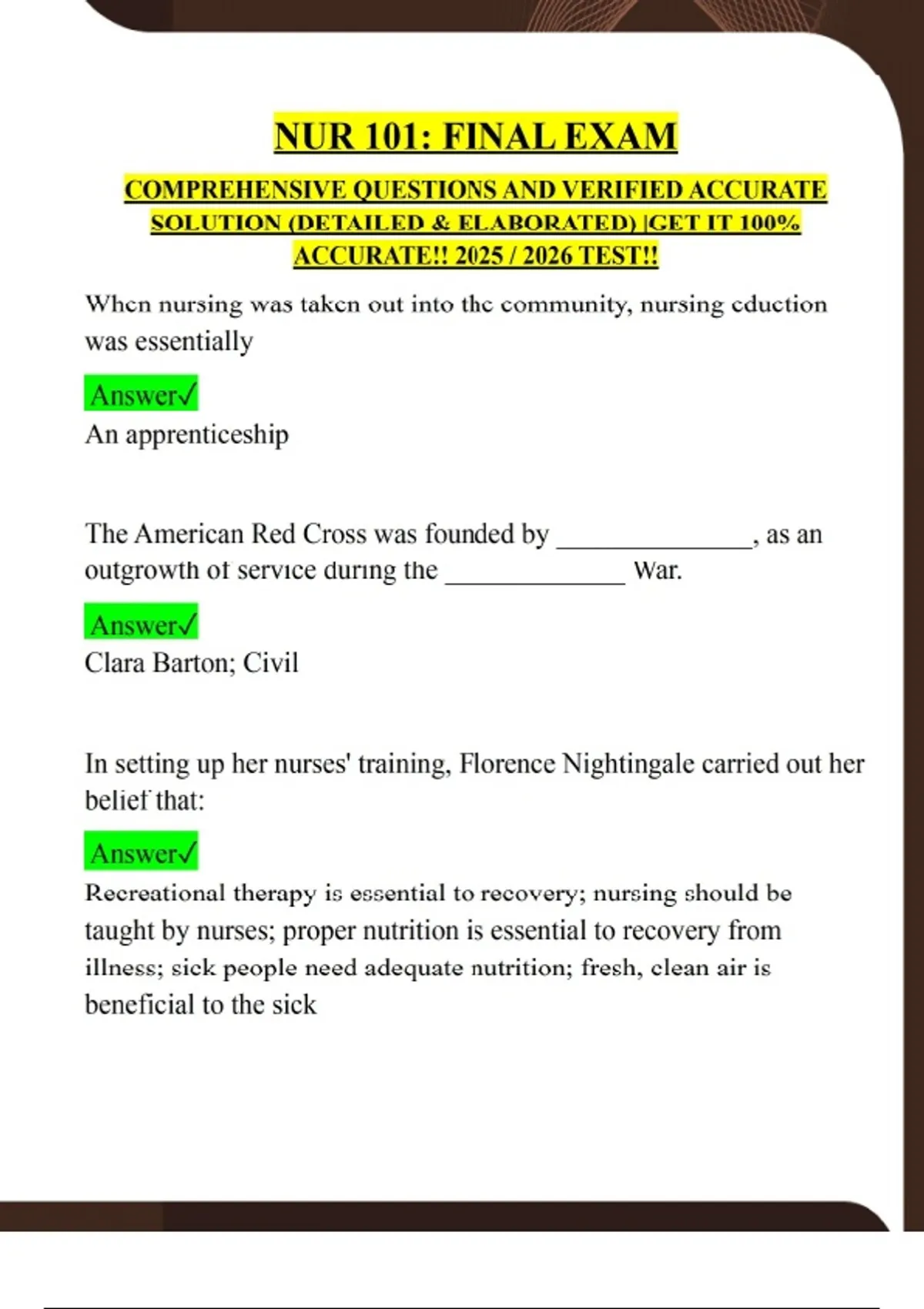 NUR 101: FINAL EXAM COMPREHENSIVE QUESTIONS AND VERIFIED ACCURATE SOLUTION (DETAILED & ELABORATED) |GET IT 100% ACCURATE!! 2025 / 2026 TEST!! When nursing was taken out into the community, nursing eduction was essentially Answer An apprenticeship The American Red Cross was founded by ______________, as an outgrowth of service during the _____________ War. Answer Clara Barton; Civil In setting up her nurses' training, Florence Nightingale carried out her belief that: Answer Recreational therapy is essential to recovery; nursing should be taught by nurses; proper nutrition is essential to recovery from illness; sick people need adequate nutrition; fresh, clean air is beneficial to the sick Inherent in any definition or philosophy of nursing are several core concepts. The core concepts include: Answer Promoting wellness; facilitating coping; preventing illness; restoring health One of the first nursing theorists was: Answer Virginia Henderson One main difference between a licensed practical nurse and a registed nurse is that the licensed practical nurse: Answer Is required to work in a supervised setting Which of the following nursing education programs prepares a nurse for a management role? Answer Baccalaureate nursing program Evidence-bases practice is based on: Answer Evidence from research that guides decision making An advantage to the patient of a managed health care system is: Answer Paying lower health insurance costs and small copayments An example of illness prevention activities would be: Answer Performing vision screenings; promoting prenatal care Which statement best describes health? Health is: Answer The state of functioning well physically, mentally, and socially Taking on the sick role occurs when a patient: Answer Buys and takes a couple of aspirin It is important that the nurse understand that certain cultural traits should be assessed in patients. Patients of Asian, African, and Hispanic descent should be assessed for: Answer Lactose intolerance Considering the patient's physical problems, as well as the psychological, sociological, and spiritual needs, results in ______________ nursing care. Answer Holistic It is important to assess a patient's actual cultural beliefs because: Answer A patient may not adhere to the usual health beliefs of her culture When setting priorities of patient needs according to Maslow's hierarchy, you should: Answer Consider airway status first; consider safety a high priority; place activity needs before belonging needs; consider elimination needs before rest and comfort needs A patient had major surgery and says she's worried about what is happening at home, is worried about not being there to coach the soccer team tomorrow, is feeling pain, and wants to see her husband. Which action would you take first? Answer Administer pain medication Which is the best description of homeostasis? Answer It is the tendency of the body to constantly adjust to changing conditions The effects of stress on a person partially depend on: Answer The perception of the stressor Common sympathetic reactions to a stressor that occurs suddenly include: Answer Pounding of the heart with rapid pulse; dilation of the pupils; increased blood pressure