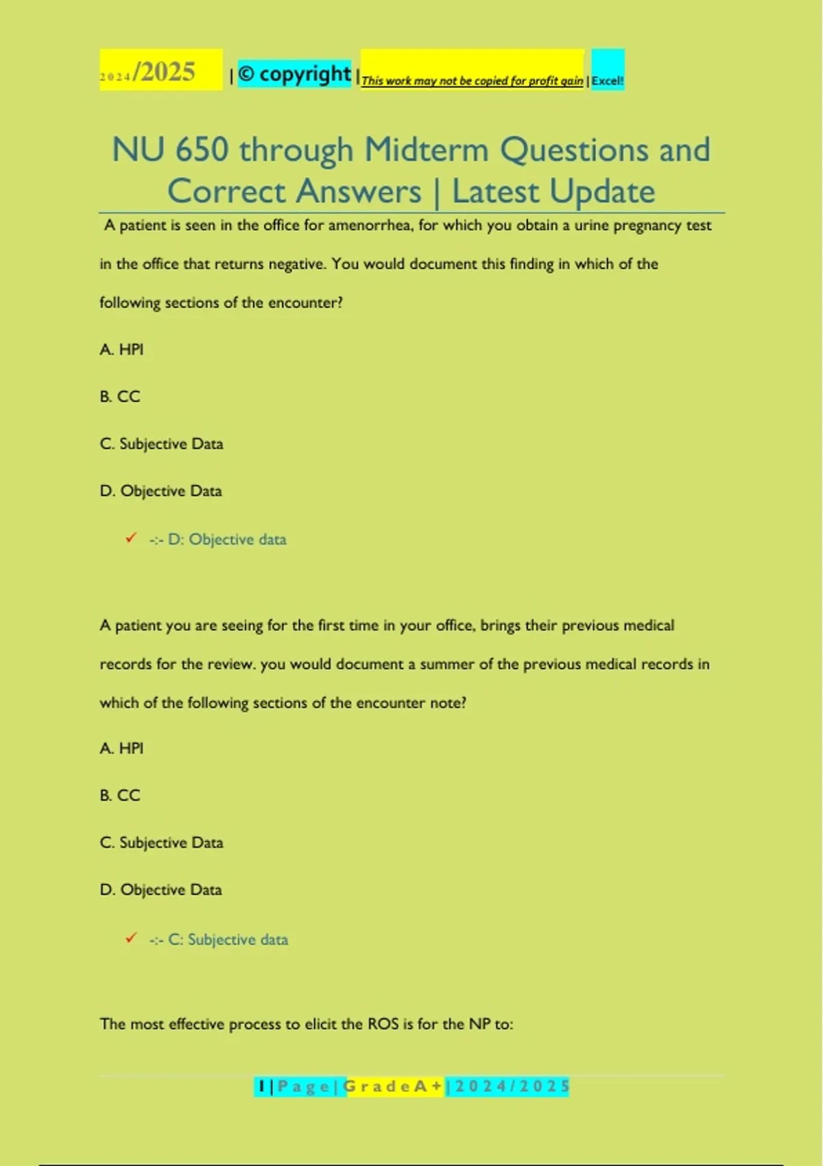 NU 650 through Midterm Questions and Correct Answers | Latest Update