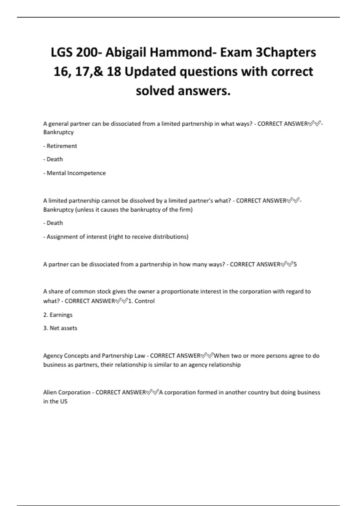 Buyout Price - CORRECT ANSWER✅✅The amount payable to a partner on his/her dissociation from a