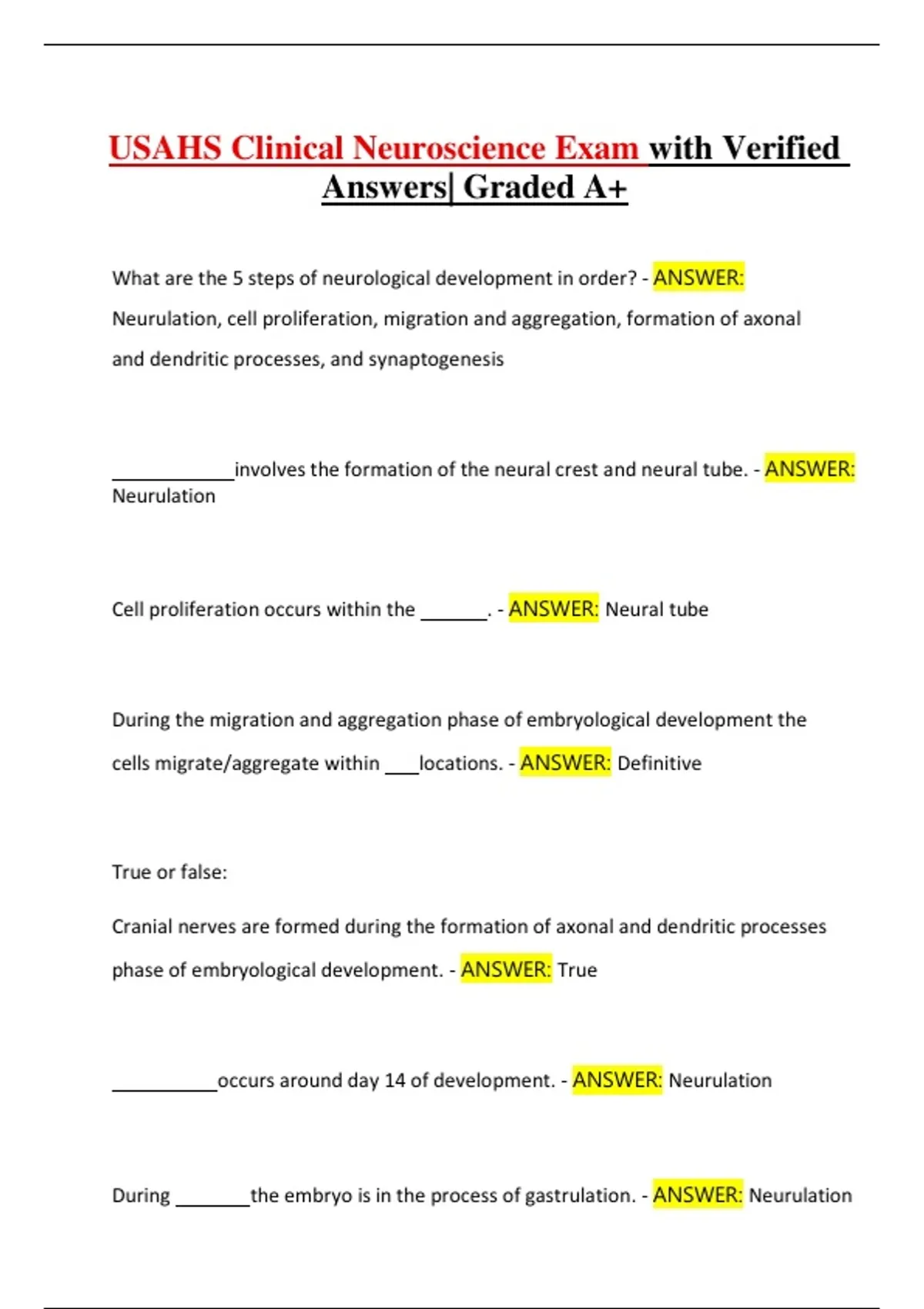 an extensive collection of verified exam questions and solutions for the USAHS Clinical Neuroscience course. It covers embryological development, neuroanatomy, cranial nerves, Brodmann areas, motor and sensory systems, neurological examination, imaging (CT/MRI), neuroplasticity, and motor control. The material is well suited for exam preparation and comprehensive review for physical therapy and health science students.
