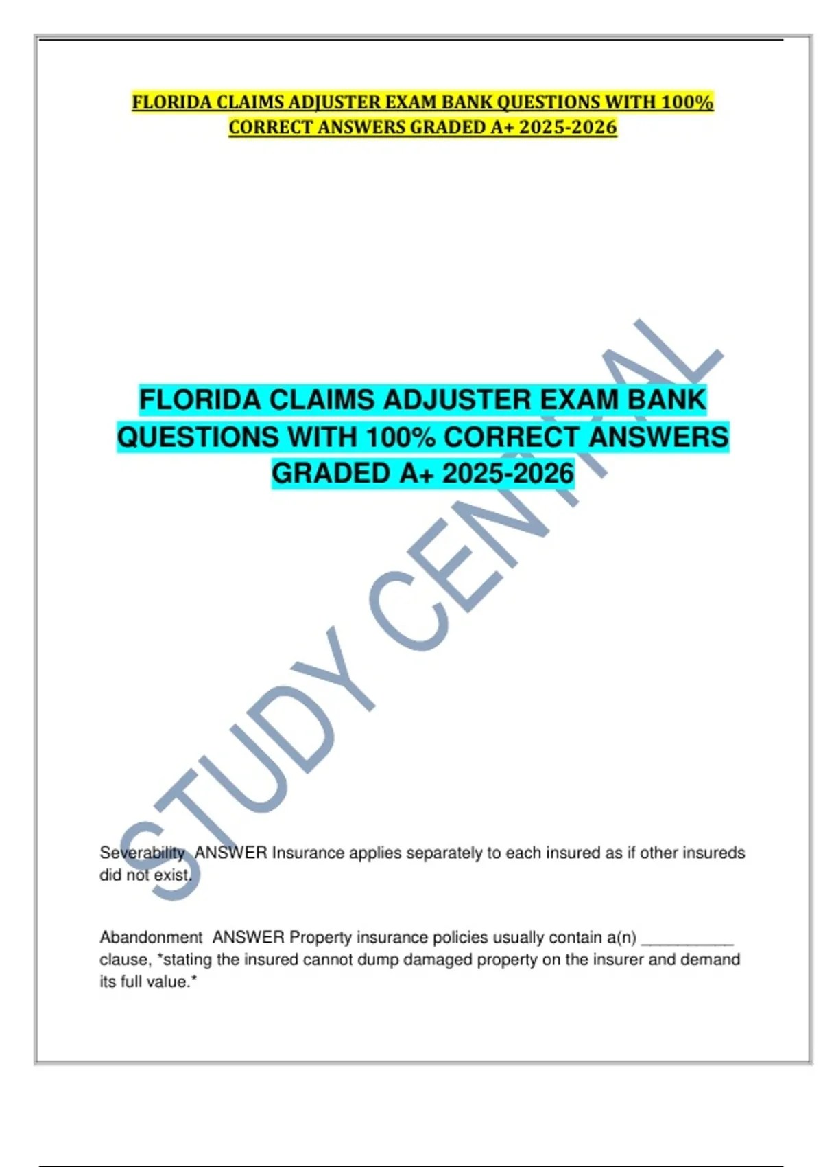This document provides a complete exam bank for the Florida Claims Adjuster Exam, featuring practice questions with 100% correct and verified answers. It is tailored for candidates preparing for the 2025–2026 exam period and covers essential topics needed to pass the Florida adjuster licensing exam with confidence.