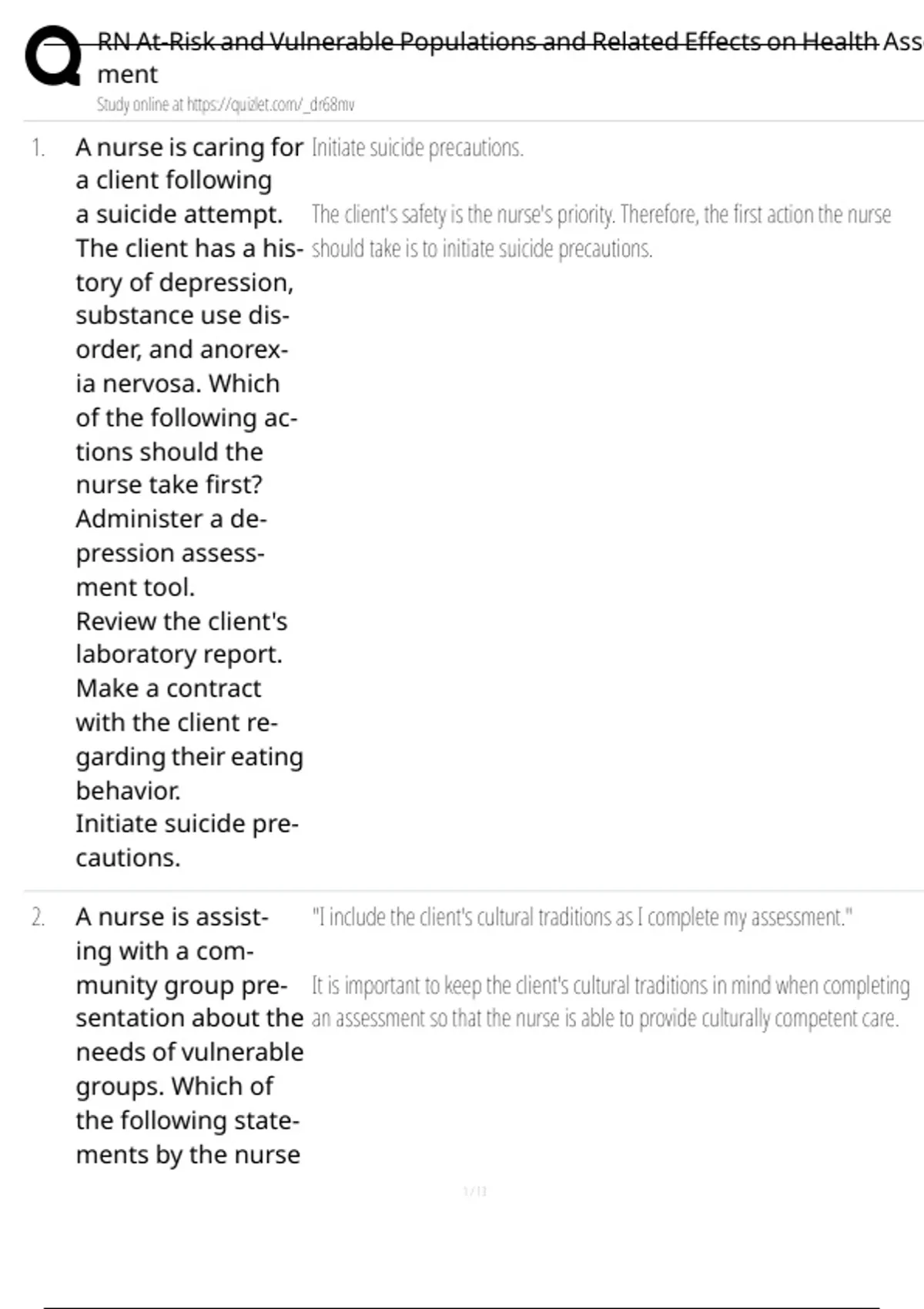 2. A nurse is assist- "I include the client's cultural traditions as I complete my assessment."