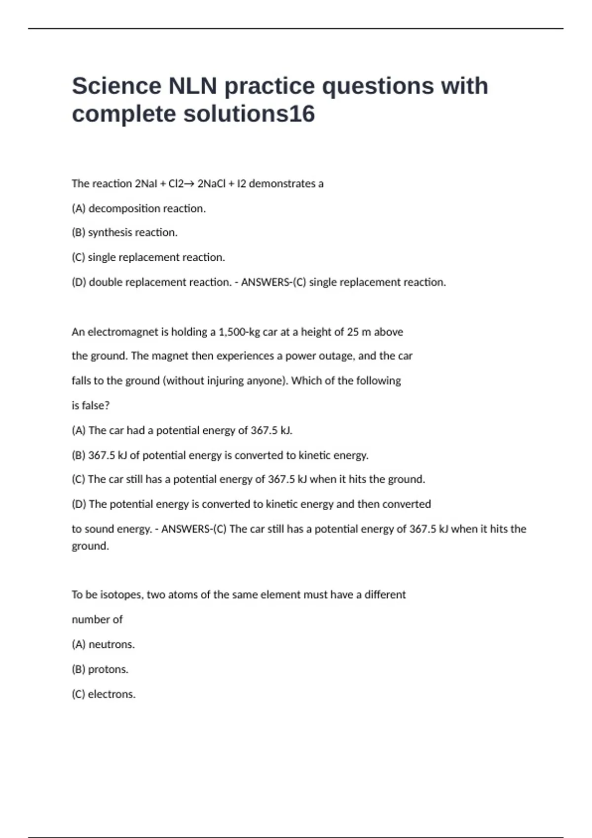 Science NLN practice questions with complete solutions