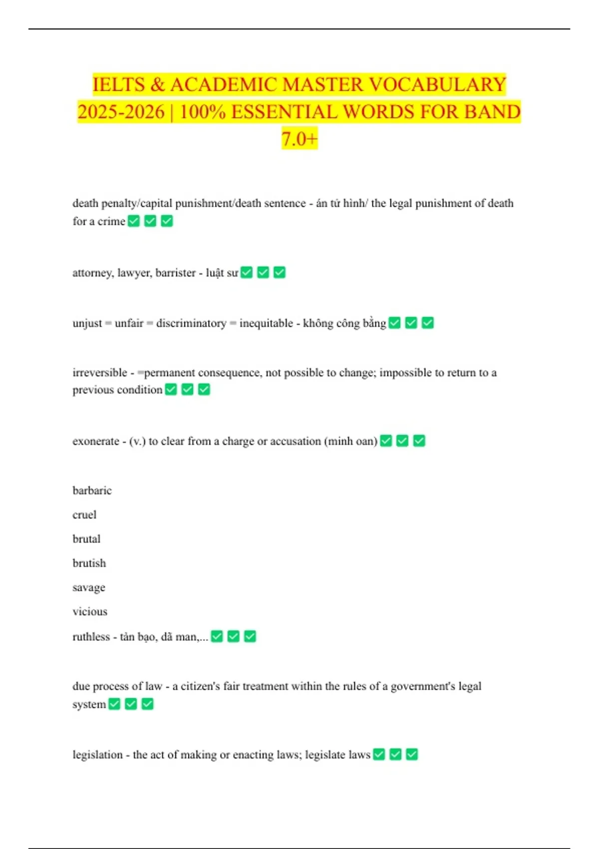 This comprehensive vocabulary collection brings together high-frequency IELTS and academic English words across a wide range of themes, including law, crime, society, science, technology, education, psychology, economics, environment, and culture. Each entry is clearly explained with simple English definitions and Vietnamese meanings, making it ideal for IELTS preparation, university studies, academic writing, reading comprehension, and speaking fluency. The list emphasizes precision, nuance, and real-world usage, helping learners express complex ideas accurately and confidently. Suitable for intermediate to advanced learners aiming for higher band scores and stronger academic performance.