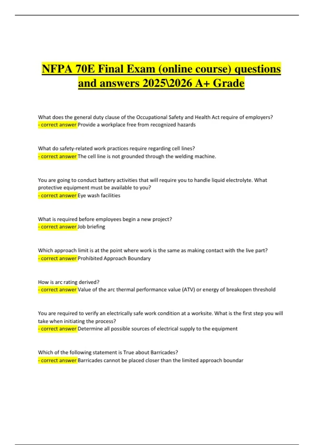The NFPA 70E Final Exam is part of the online course on Electrical Safety in the Workplace. It evaluates knowledge of arc flash hazards, PPE categories, lockout/tagout procedures, shock protection boundaries, and safe work practices. The 2025/2026 verified study guides include multiple-choice and case-based questions with rationales, already graded A+, ensuring readiness for compliance and certification.