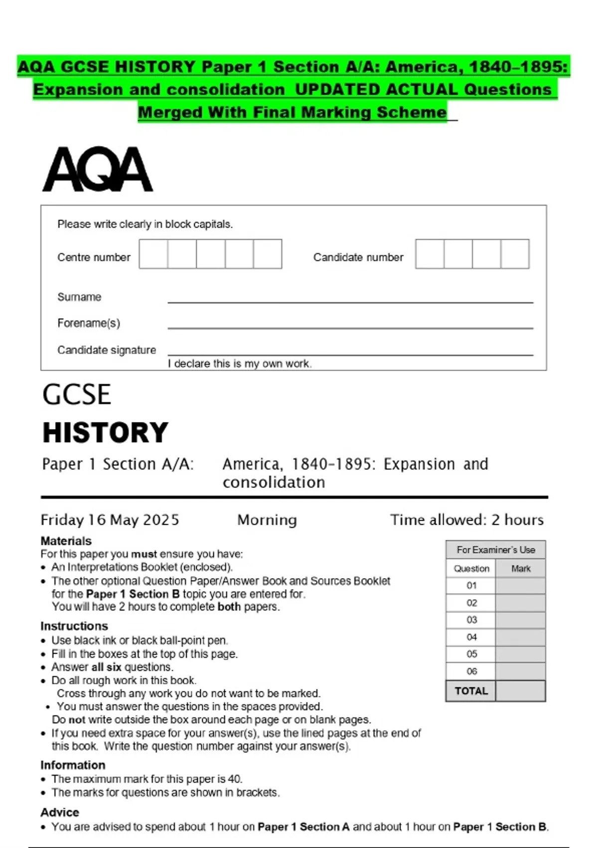 AQA GCSE HISTORY Paper 1 Section A/A: America, 1840–1895: Expansion and consolidation UPDATED ACTUAL Questions Merged With Final Marking Scheme