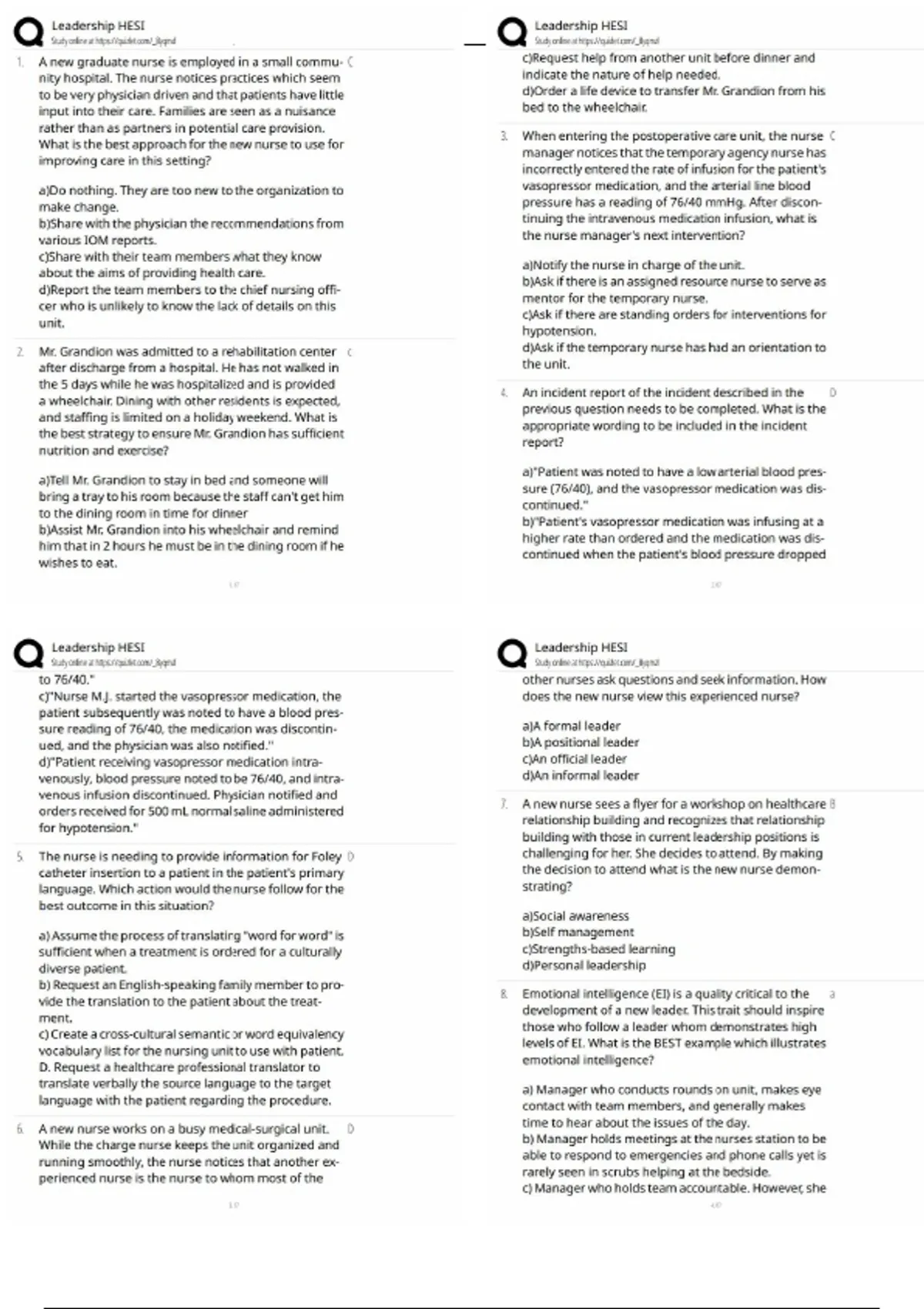 Leadership HESI exam prep designed to help students score 100%. Covers delegation, prioritization, management styles, quality improvement, legal/ethical leadership, and HESI-style practice questions. Updated for the 2025 Leadership HESI exam and ideal for quizzes, finals, and remediation success.