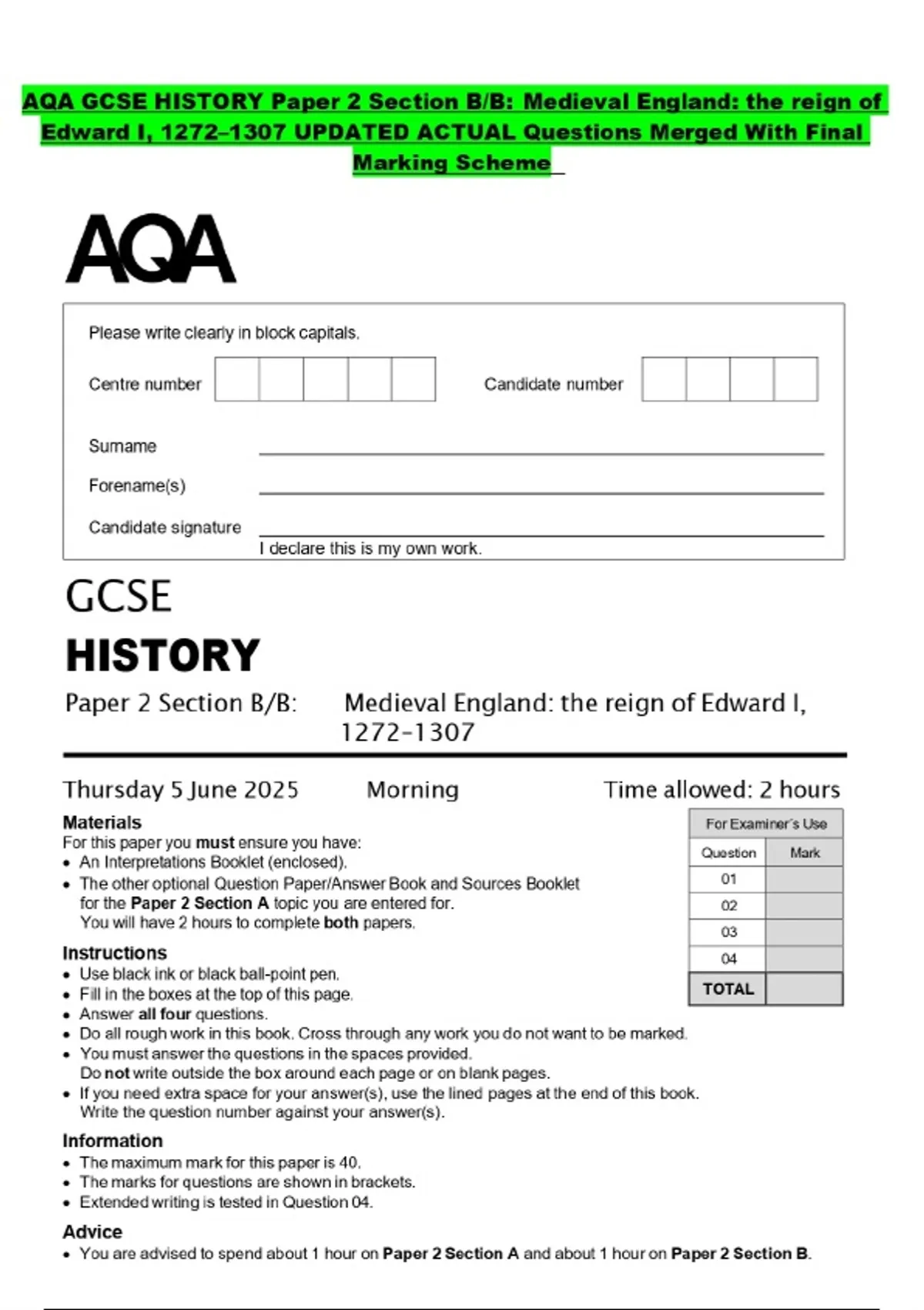 AQA GCSE HISTORY Paper 2 Section B/B: Medieval England: the reign of Edward I, 1272–1307 UPDATED ACTUAL Questions Merged With Final Marking Scheme