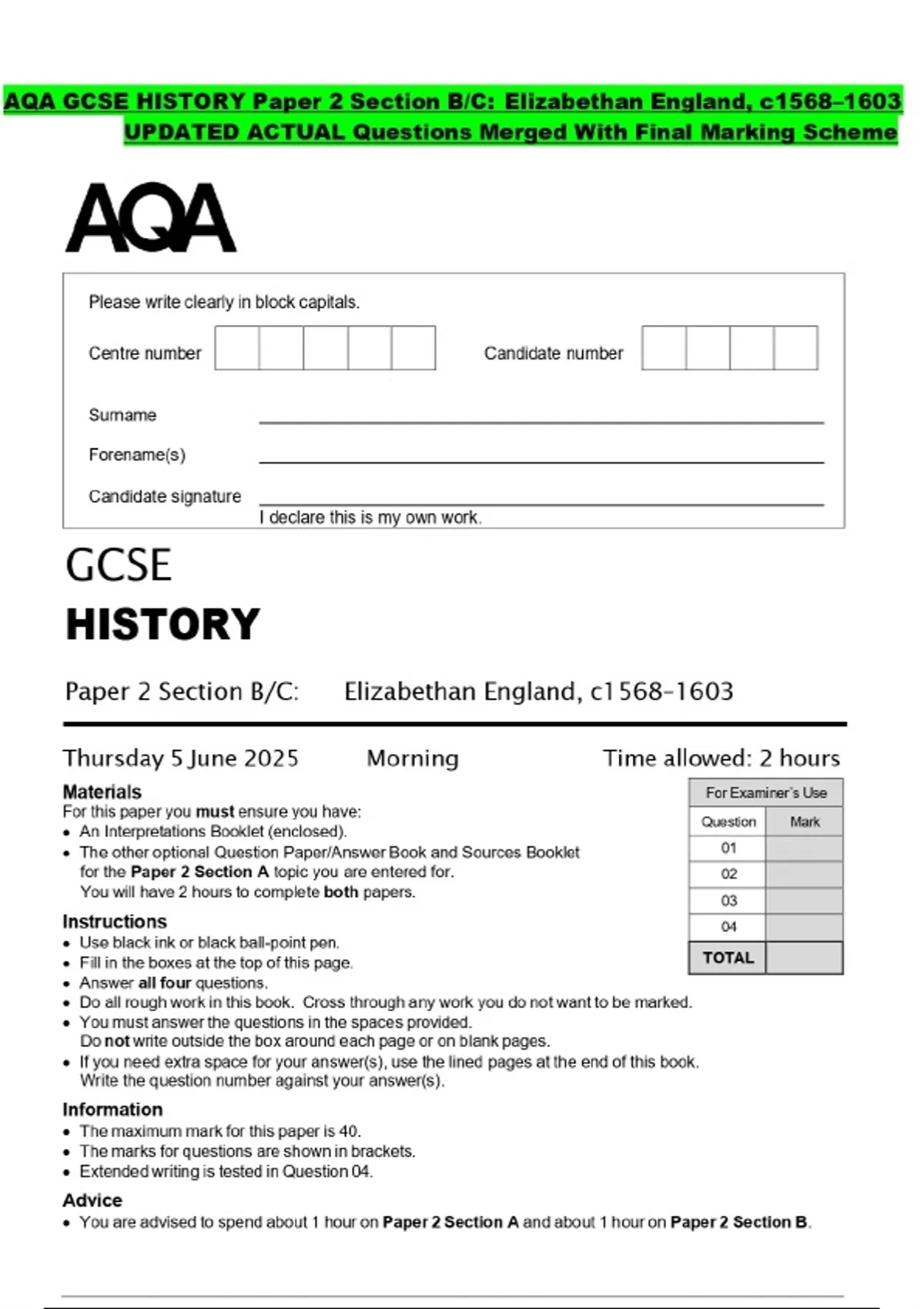 AQA GCSE HISTORY Paper 2 Section B/C: Elizabethan England, c1568–1603 UPDATED ACTUAL Questions Merged With Final Marking Scheme