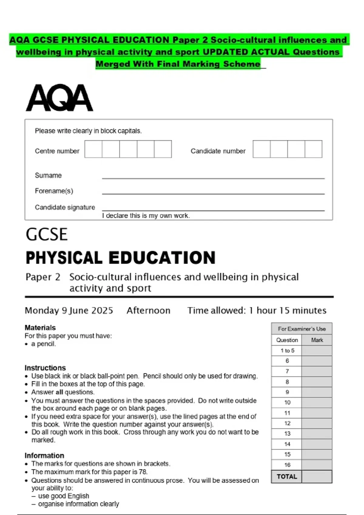 AQA GCSE PHYSICAL EDUCATION Paper 2 Socio-cultural influences and wellbeing in physical activity and sport UPDATED ACTUAL Questions Merged With Final Marking Scheme