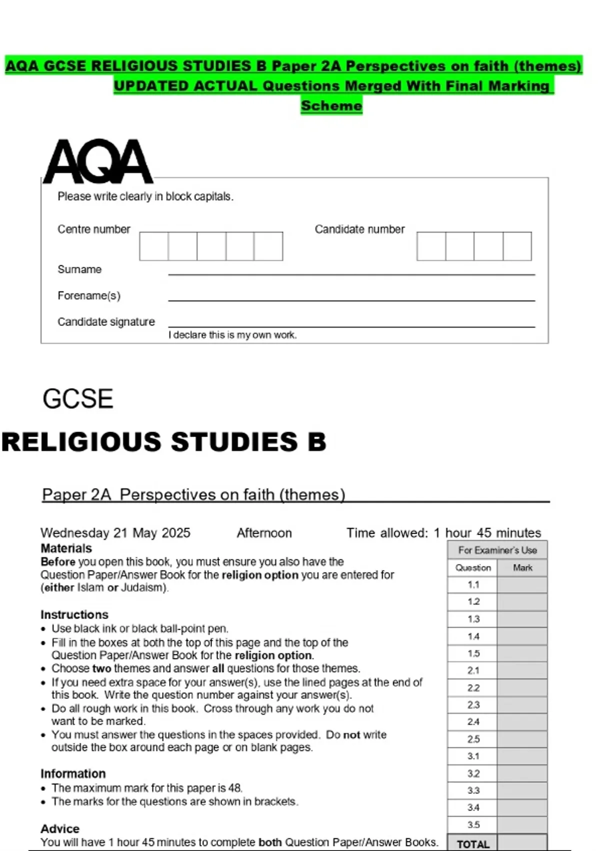 AQA GCSE RELIGIOUS STUDIES B Paper 2A Perspectives on faith (themes) UPDATED ACTUAL Questions Merged With Final Marking Scheme