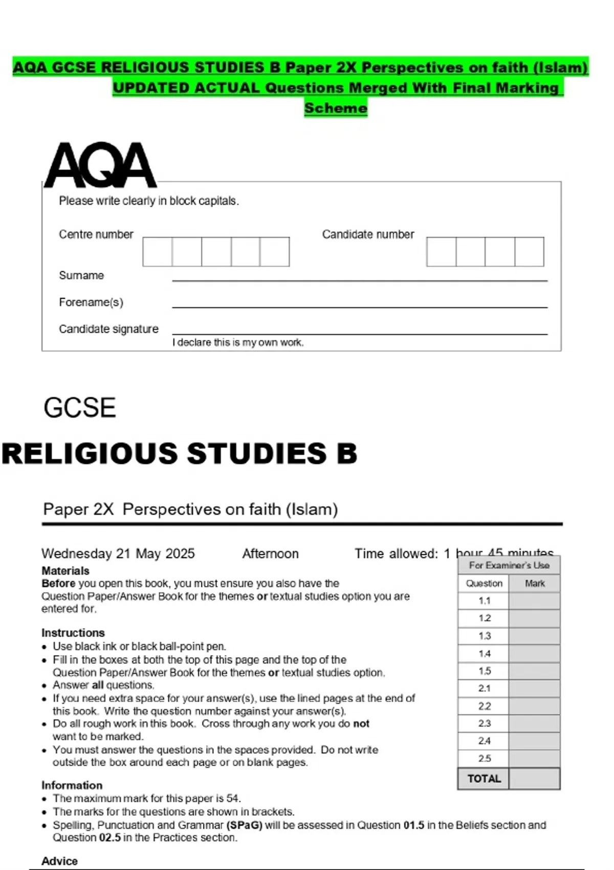 AQA GCSE RELIGIOUS STUDIES B Paper 2X Perspectives on faith (Islam) UPDATED ACTUAL Questions Merged With Final Marking Scheme