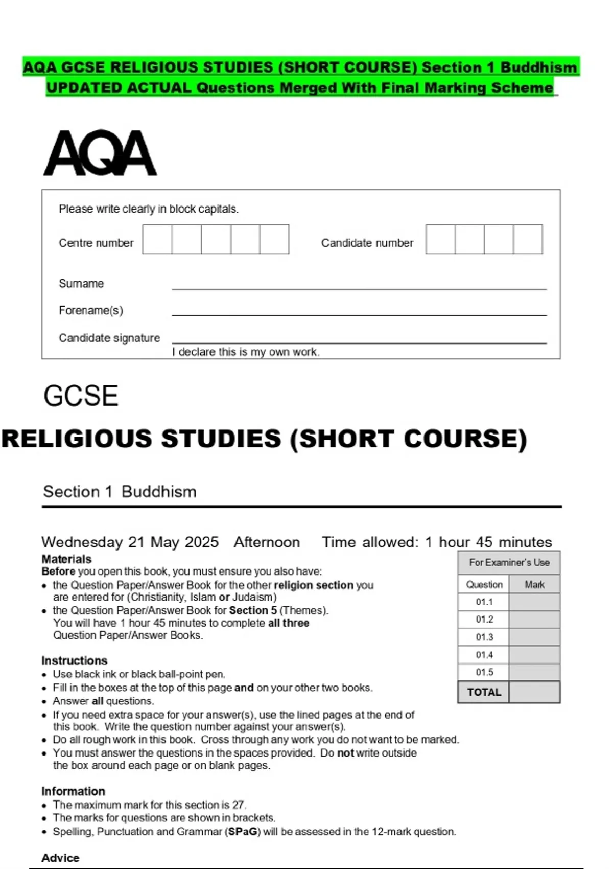 AQA GCSE RELIGIOUS STUDIES (SHORT COURSE) Section 1 Buddhism UPDATED ACTUAL Questions Merged With Final Marking Scheme