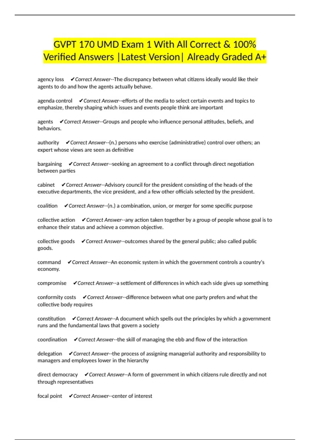 politics ✔Correct Answer--the process through which individuals and groups reach agreement on a