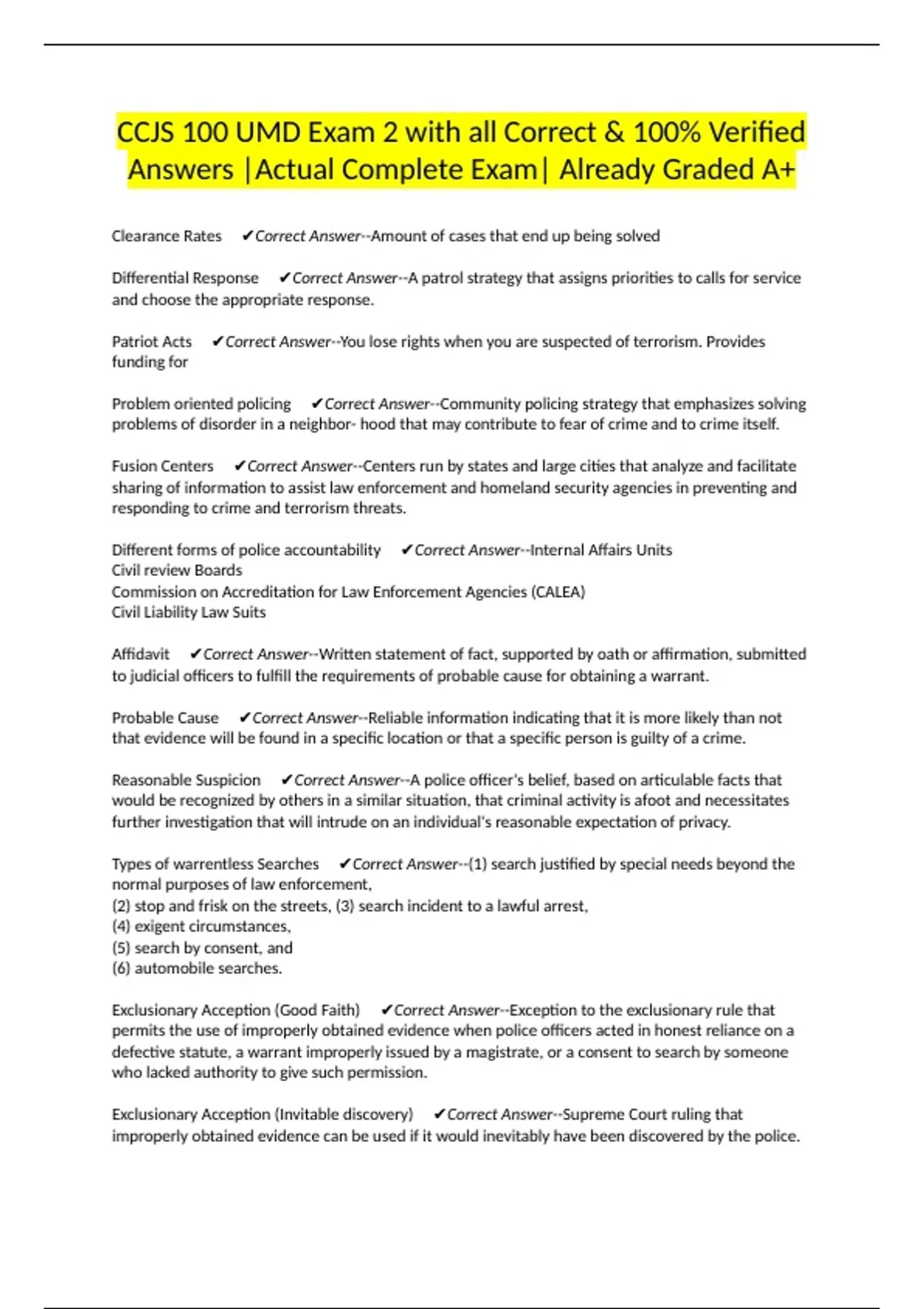 Probable Cause ✔Correct Answer--Reliable information indicating that it is more likely than not