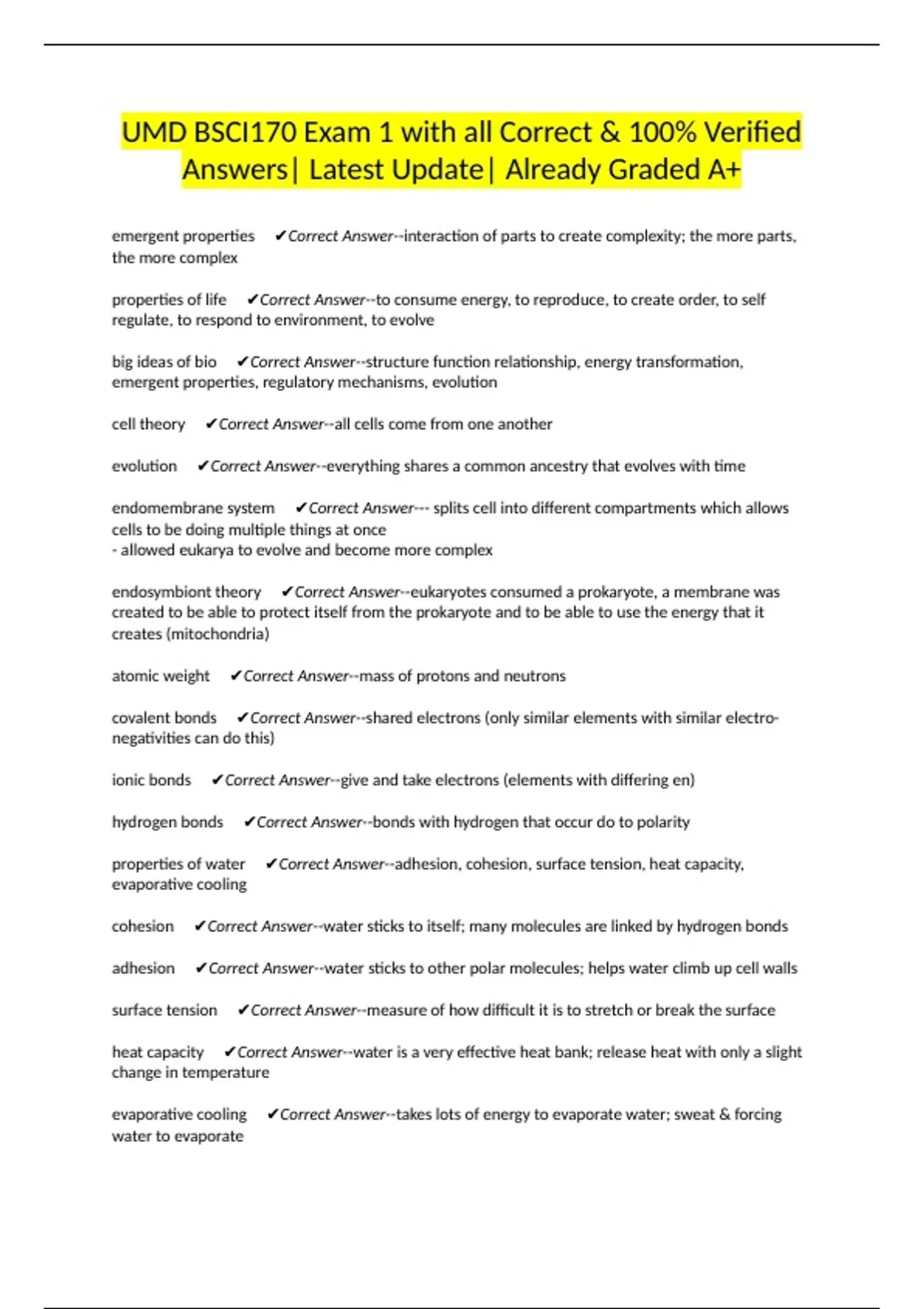 properties of water ✔Correct Answer--adhesion, cohesion, surface tension, heat capacity,