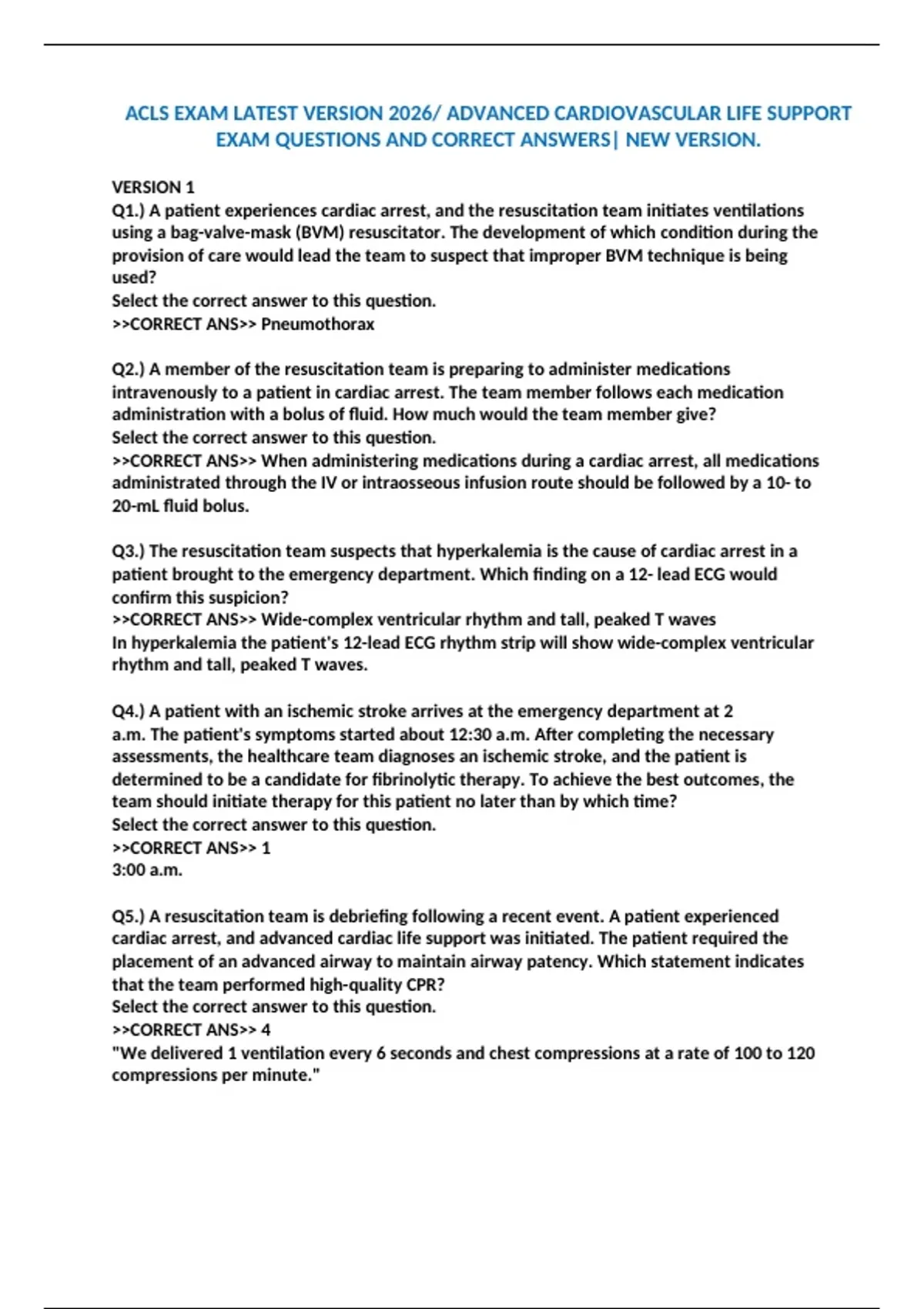 ACLS EXAM LATEST VERSION 2026/ ADVANCED CARDIOVASCULAR LIFE SUPPORT EXAM QUESTIONS AND CORRECT ANSWERS| NEW VERSION. VERSION 1 Q1.) A patient experiences cardiac arrest, and the resuscitation team initiates ventilations using a bag-valve-mask (BVM) resuscitator. The development of which condition during the provision of care would lead the team to suspect that improper BVM technique is being used? Select the correct answer to this question. CORRECT ANS Pneumothorax
