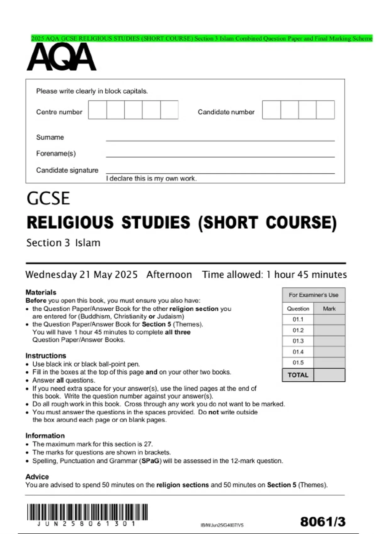 2025 AQA GCSE RELIGIOUS STUDIES (SHORT COURSE) Section 3 Islam Combined Question Paper and Final Marking Scheme
