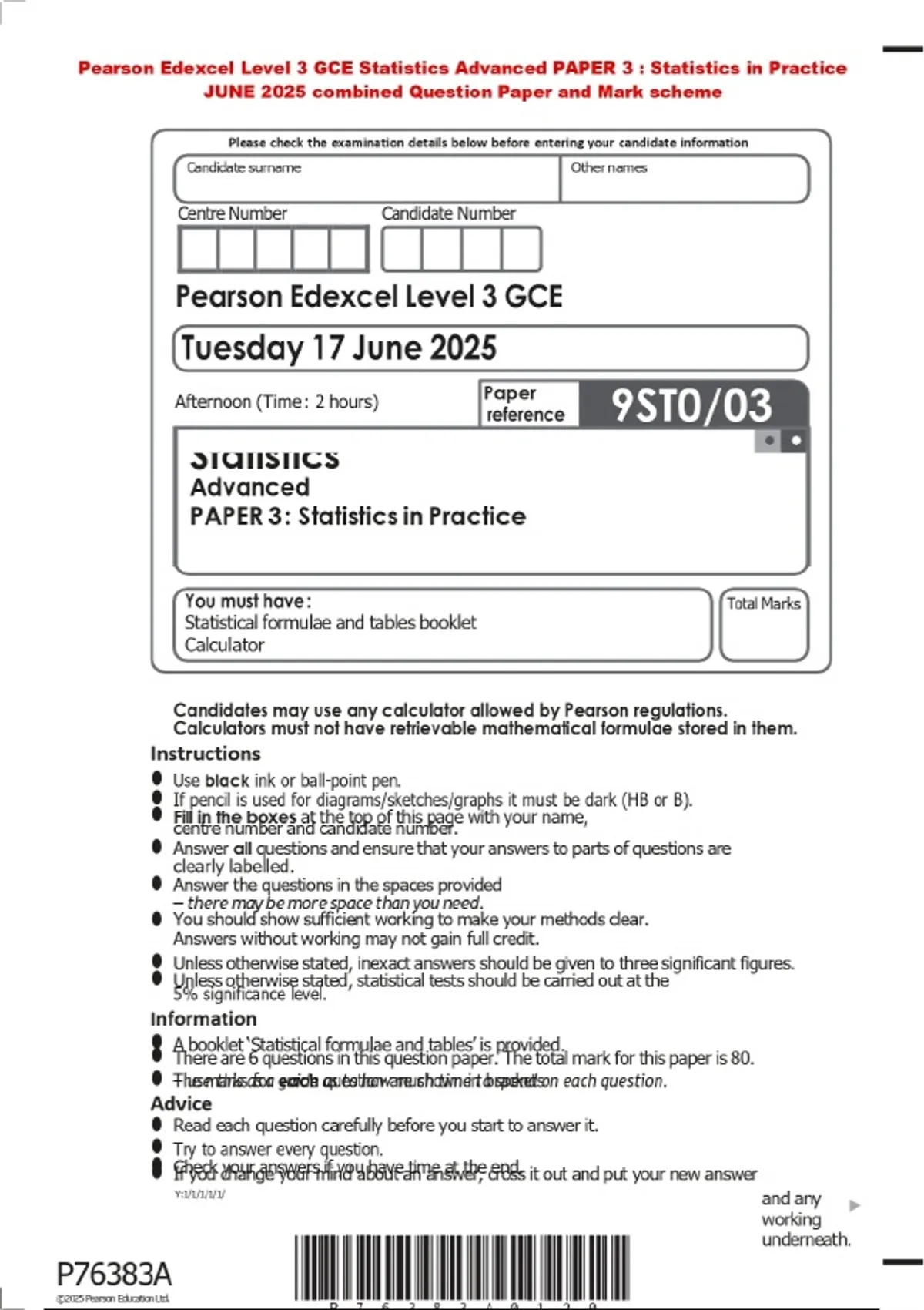 BUNDLE:::Pearson Edexcel Level 3 GCE Statistics Advanced PAPER 2025 Combined Question Paper and Mark Scheme