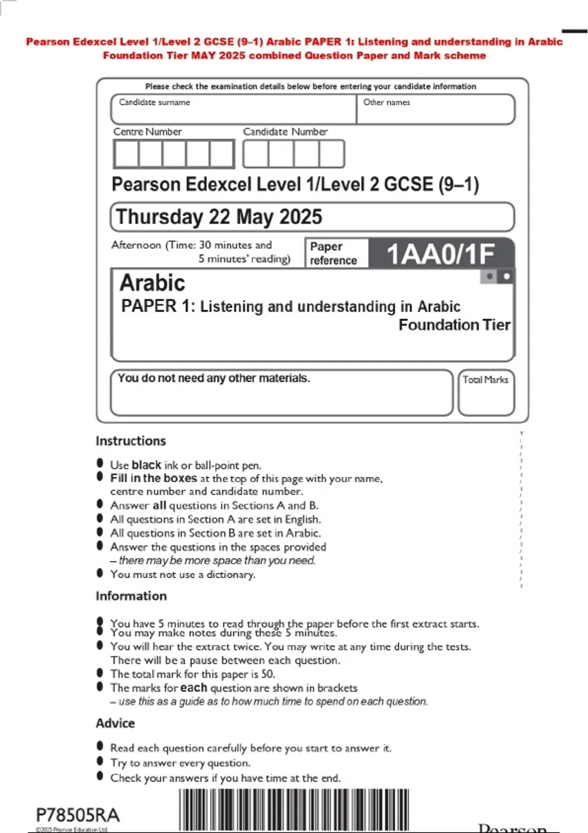 Pearson Edexcel Level 1/Level 2 GCSE (9–1) Arabic PAPER 1: Listening and understanding in Arabic Foundation Tier MAY 2025 combined Question Paper and Mark scheme