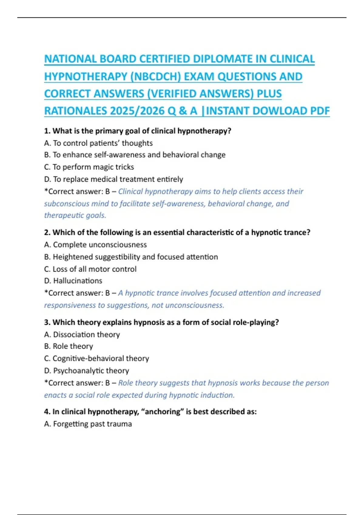Comprehensive preparation guide for the National Board Certified Diplomat in Clinical Hypnotherapy (NBCDCH). Includes practice questions, correct answers, and detailed explanations to help candidates master advanced clinical hypnotherapy techniques, ethical considerations, and client management skills. Ideal for certification readiness and professional development.