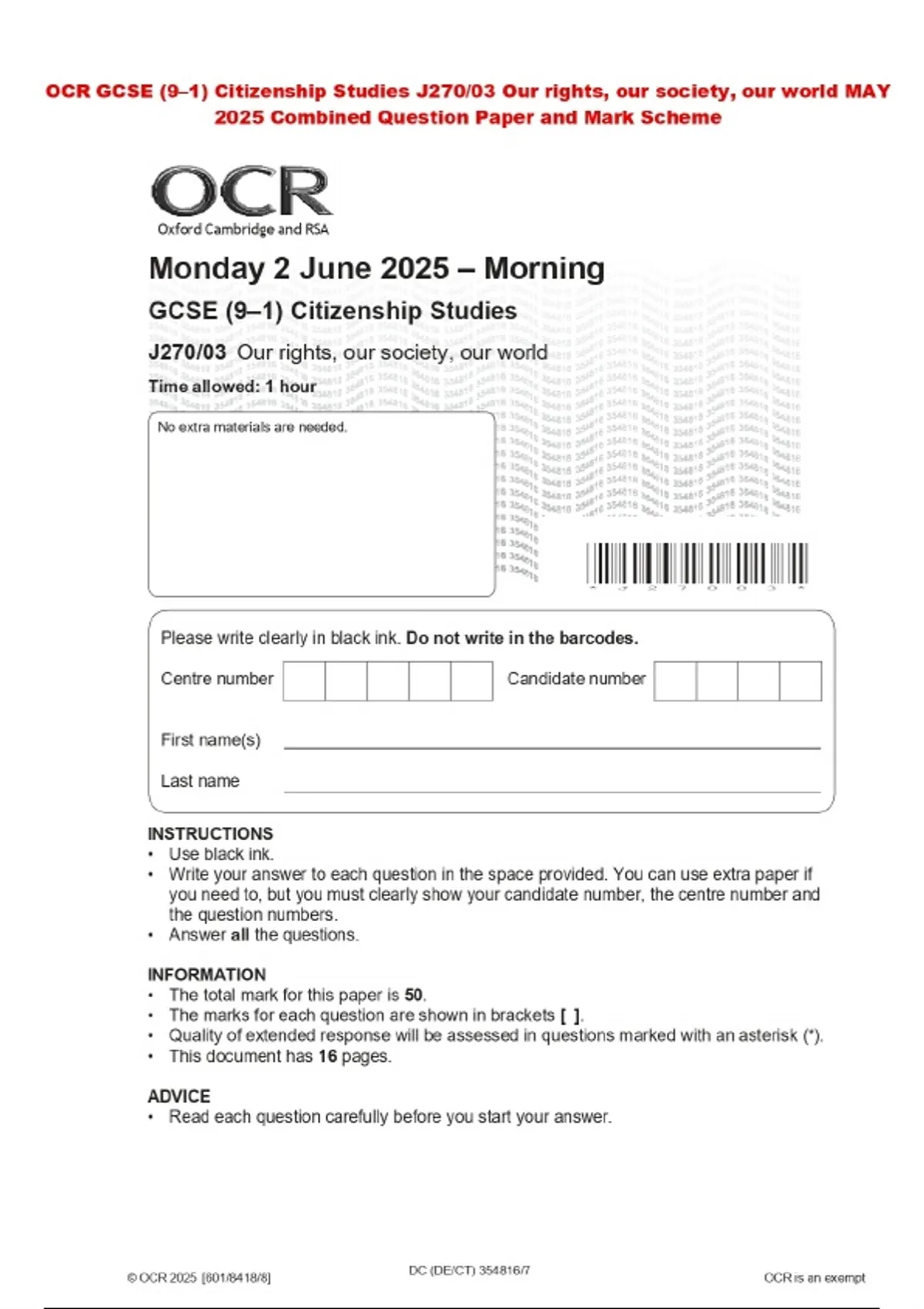 PACKAGE DEAL::: OCR GCSE (9–1) Citizenship Studies 2025 Merged Question Paper and Final Mark scheme