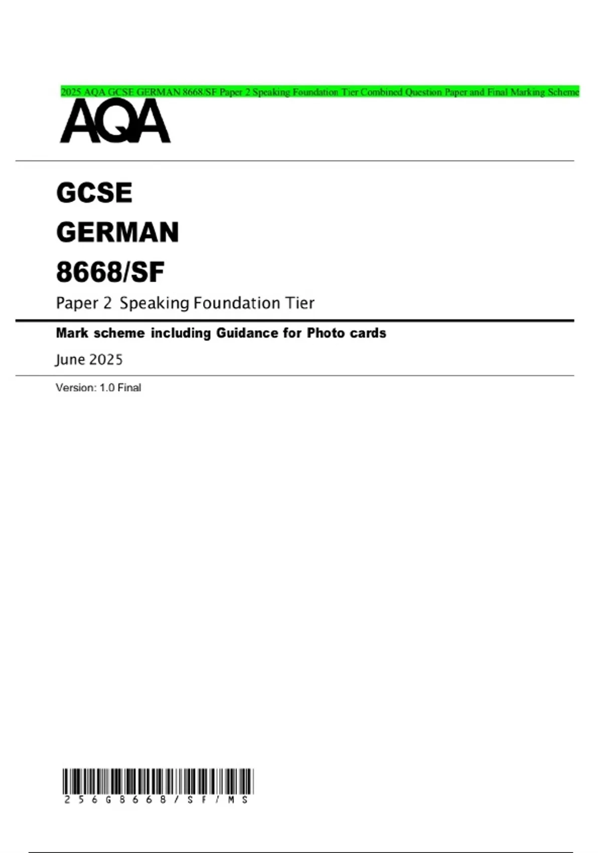 2025 AQA GCSE GERMAN 8668/SF Paper 2 Speaking Foundation Tier Combined Question Paper and Final Marking Scheme