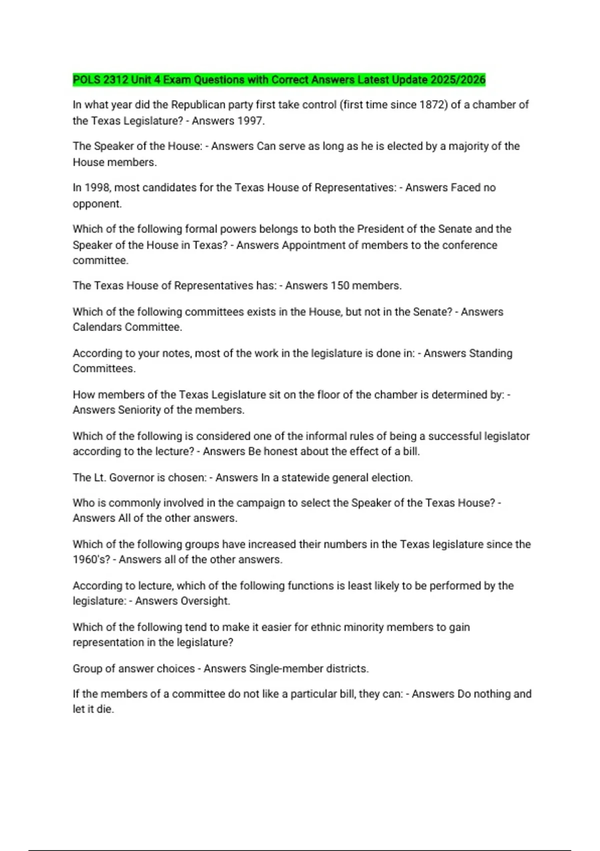 POLS 2312 Unit 4 Exam Questions with Correct Answers Latest Update 2025/2026 In what year did the Republican party first take control (first time since 1872) of a chamber of the Texas Legislature? - Answers 1997. The Speaker of the House: - Answers Can serve as long as he is elected by a majority of the House members. In 1998, most candidates for the Texas House of Representatives: - Answers Faced no opponent. Which of the following formal powers belongs to both the President of the Senate and the Speaker of the House in Texas? - Answers Appointment of members to the conference committee. The Texas House of Representatives has: - Answers 150 members. Which of the following committees exists in the House, but not in the Senate? - Answers Calendars Committee. According to your notes, most of the work in the legislature is done in: - Answers Standing Committees. How members of the Texas Legislature sit on the floor of the chamber is determined by: - Answers Seniority of the members. Which of the following is considered one of the informal rules of being a successful legislator according to the lecture? - Answers Be honest about the effect of a bill. The Lt. Governor is chosen: - Answers In a statewide general election. Who is commonly involved in the campaign to select the Speaker of the Texas House? - Answers All of the other answers. Which of the following groups have increased their numbers in the Texas legislature since the 1960's? - Answers all of the other answers. According to lecture, which of the following functions is least likely to be performed by the legislature: - Answers Oversight. Which of the following tend to make it easier for ethnic minority members to gain representation in the legislature? Group of answer choices - Answers Single-member districts. If the members of a committee do not like a particular bill, they can: - Answers Do nothing and let it die. The players in the "iron triangle" are? - Answers the legislative committee, the interest group and the bureaucratic agency. Which of the following is NOT a characteristics of the Texas Legislature: - Answers Annual (every year) sessions. In the Texas Senate, a bill can be introduced by: - Answers a member of the Senate. If a colleague moves to table a bill that you are trying to pass. You should: - Answers Be very upset with him. The term reapportionment refers to: - Answers The process of redrawing the boundaries of the legislative districts every ten years.