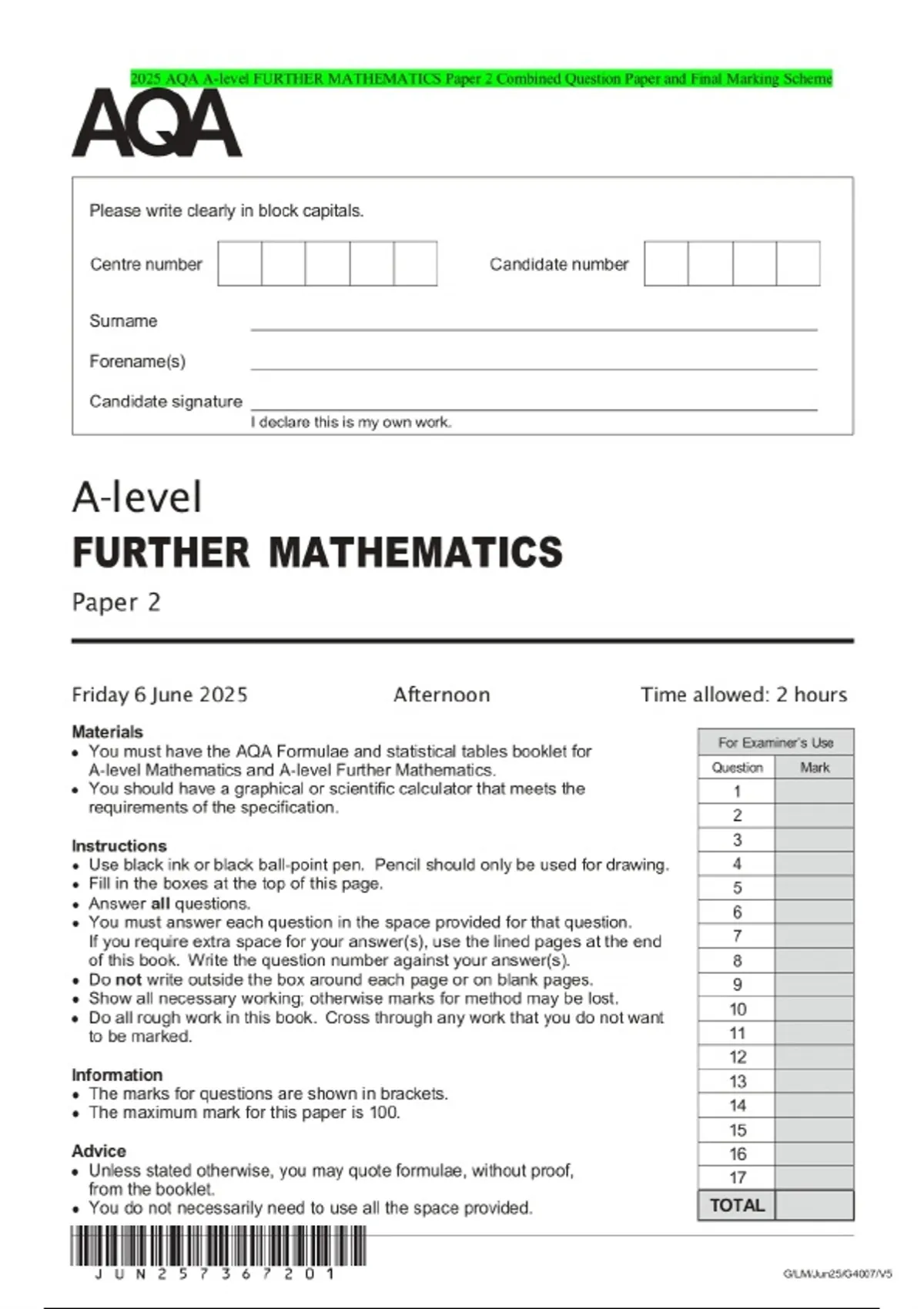 2025 AQA A-level FURTHER MATHEMATICS Paper 2 Combined Question Paper and Final Marking Scheme