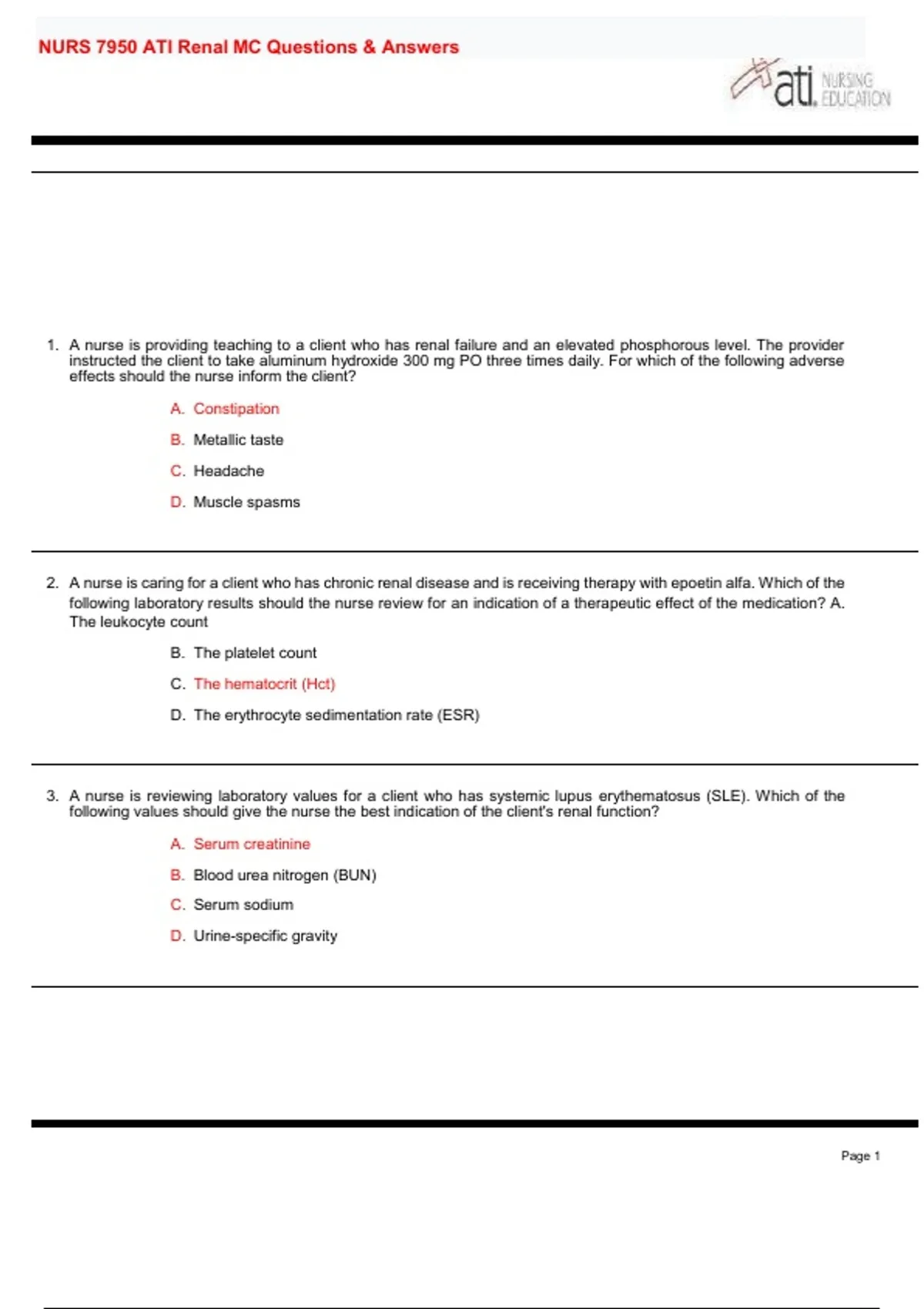 ATI Renal Exam Questions & Answers 2026 – NURS 7950 Practice Test on Kidney Disease, Dialysis, Nursing Care