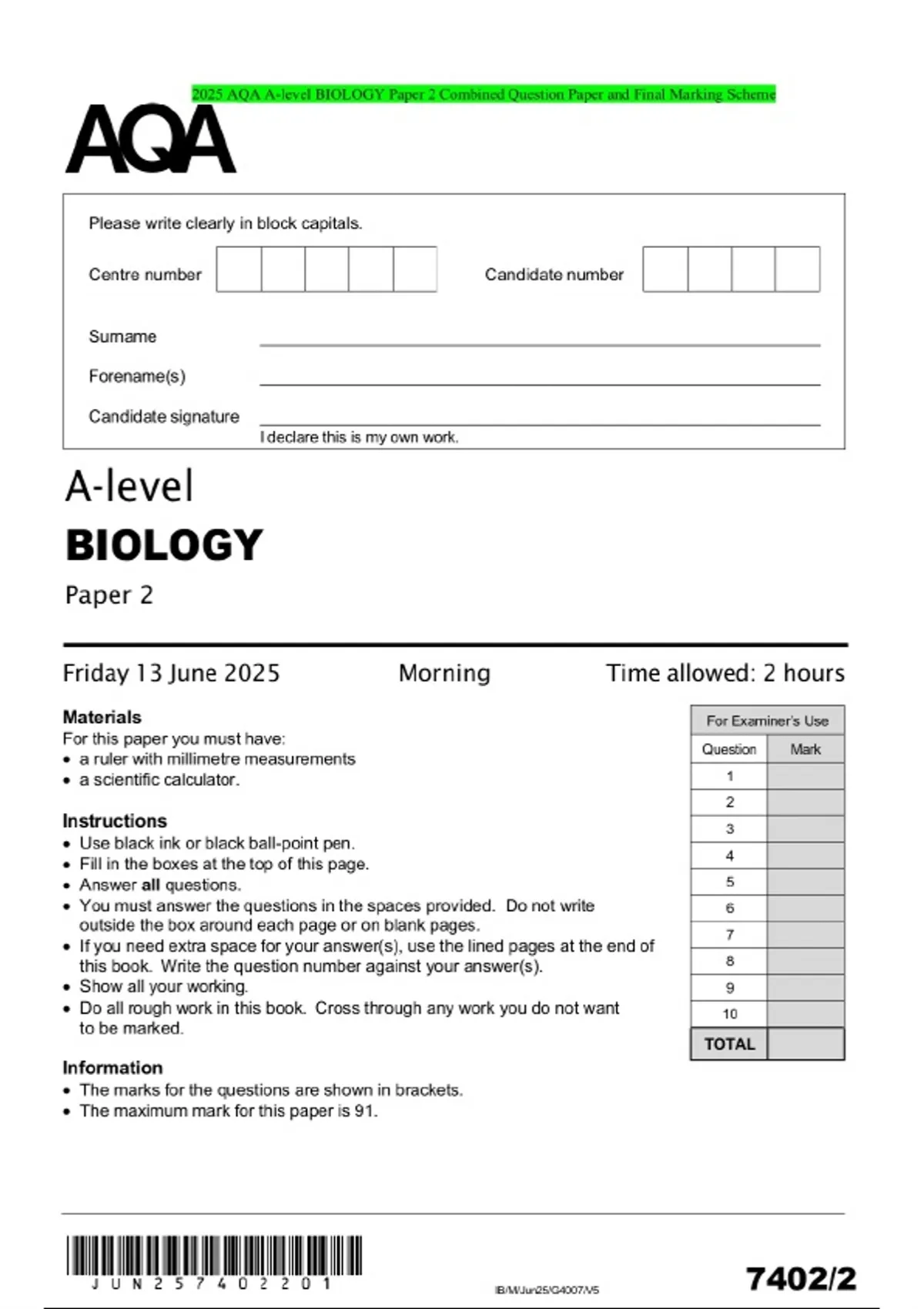 2025 AQA A-level BIOLOGY Paper 2 Combined Question Paper and Final Marking Scheme